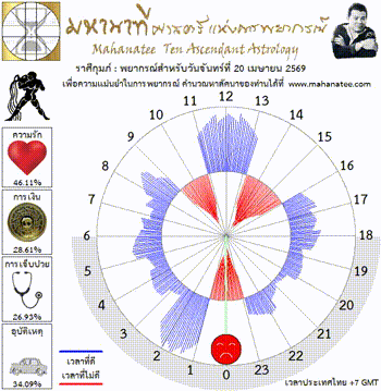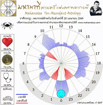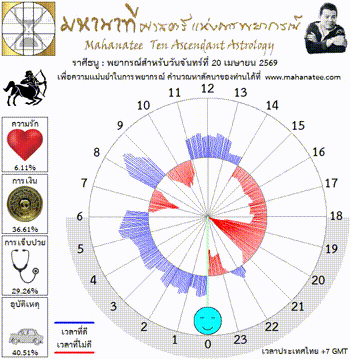 คำนวณหาลัคนาที่ถูกต้องของท่านได้ที่ https://www.mahanatee.com/ และ พยากรณ์พื้นดวงชะตาฟรี ไม่คิดค่าใช้จ่าย แผนภูมิและพยากรณ์ 12 ราศี สำหรับ วันจันทร์ที่ 20 เมษายน 2569 เลื่อนไปหาราศีที่ต้องการ และเปิดเสียงด้วย ** หมายเหตุ คลิปจะเล่นได้ 3 วันก่อนวันที่พยากรณ์