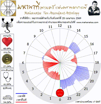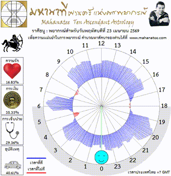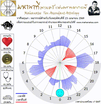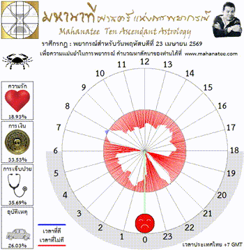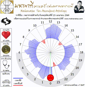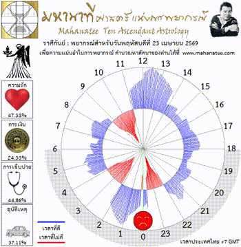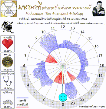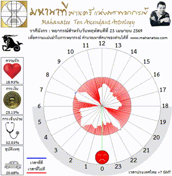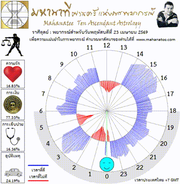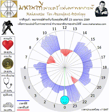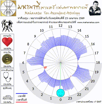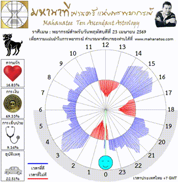 แผนภูมิและพยากรณ์ 12 ราศี สำหรับ วันพฤหัสบดีที่ 23 เมษายน 2569 เลื่อนไปหาราศีที่ต้องการ และเปิดเสียงด้วย ** หมายเหตุ คลิปจะเล่นได้ 3 วันก่อนวันที่พยากรณ์