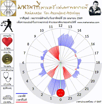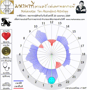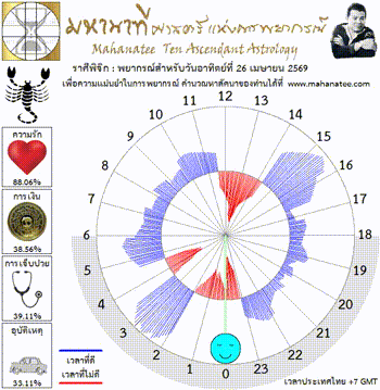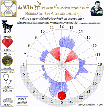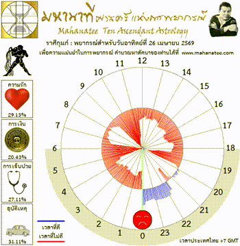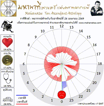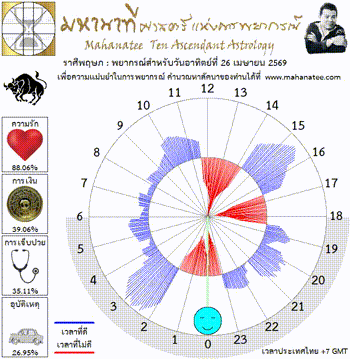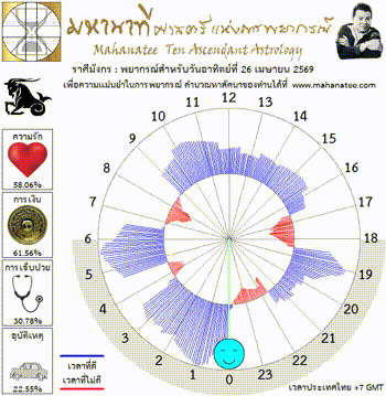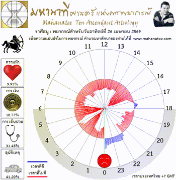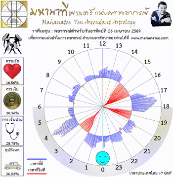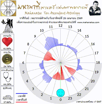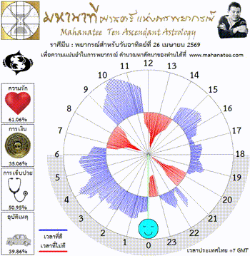 แผนภูมิและพยากรณ์ 12 ราศี สำหรับ วันอาทิตย์ที่ 26 เมษายน 2569 เลื่อนไปหาราศีที่ต้องการ และเปิดเสียงด้วย ** หมายเหตุ คลิปจะเล่นได้ 3 วันก่อนวันที่พยากรณ์