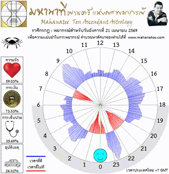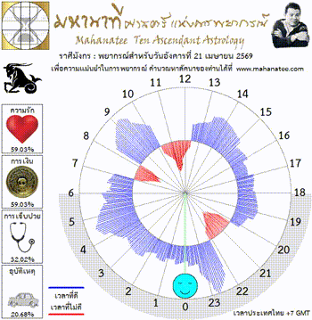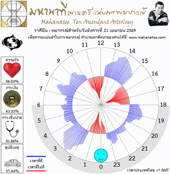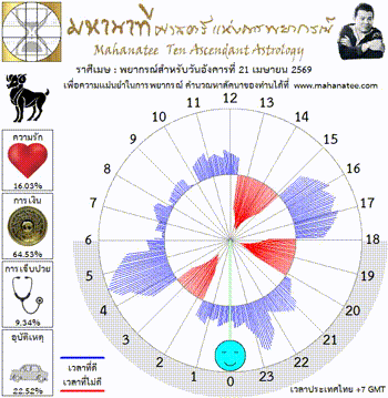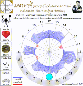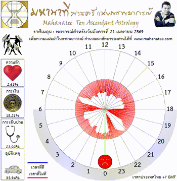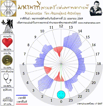 แผนภูมิและพยากรณ์ 12 ราศี สำหรับ วันอังคารที่ 21 เมษายน 2569 เลื่อนไปหาราศีที่ต้องการ และเปิดเสียงด้วย ** หมายเหตุ คลิปจะเล่นได้ 3 วันก่อนวันที่พยากรณ์