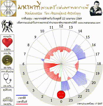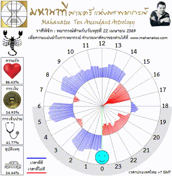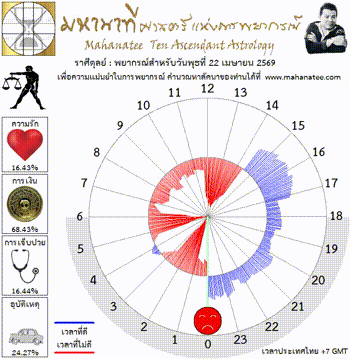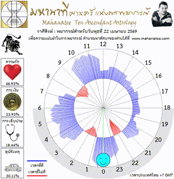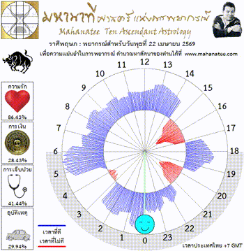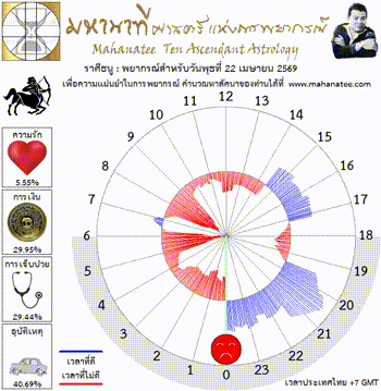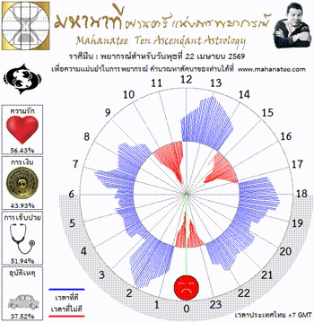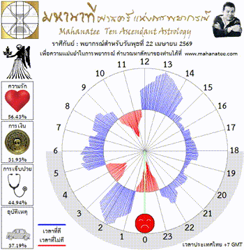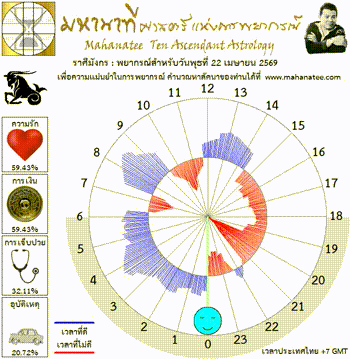 แผนภูมิและพยากรณ์ 12 ราศี สำหรับ วันพุธที่ 22 เมษายน 2569 เลื่อนไปหาราศีที่ต้องการ และเปิดเสียงด้วย ** หมายเหตุ คลิปจะเล่นได้ 3 วันก่อนวันที่พยากรณ์