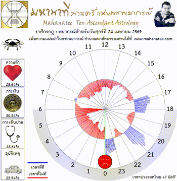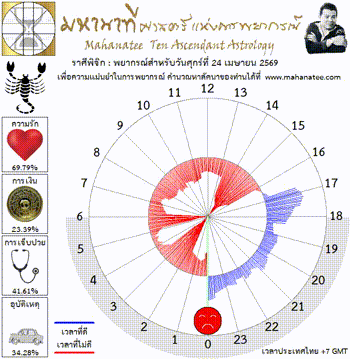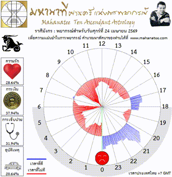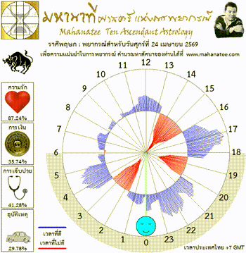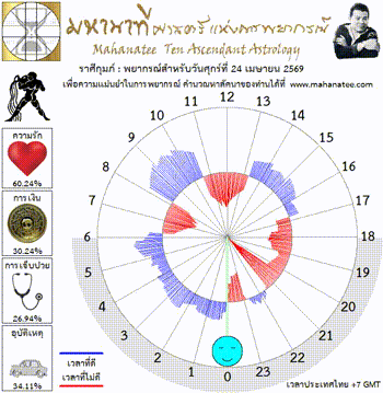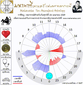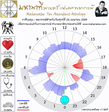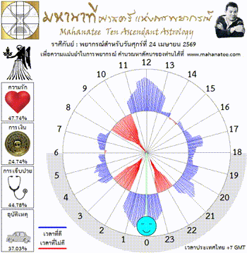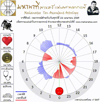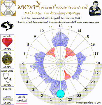 แผนภูมิและพยากรณ์ 12 ราศี สำหรับ วันศุกร์ที่ 24 เมษายน 2569 เลื่อนไปหาราศีที่ต้องการ และเปิดเสียงด้วย ** หมายเหตุ คลิปจะเล่นได้ 3 วันก่อนวันที่พยากรณ์