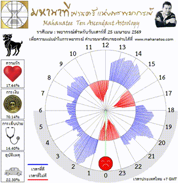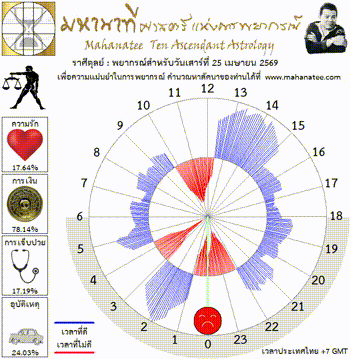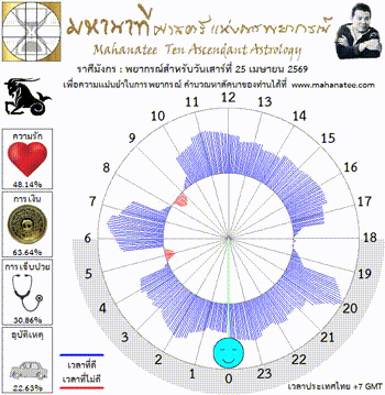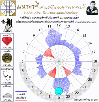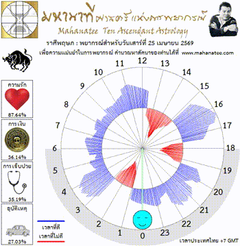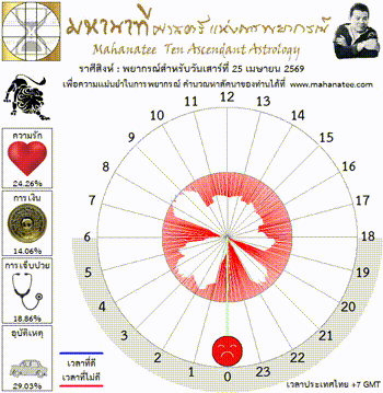 แผนภูมิและพยากรณ์ 12 ราศี สำหรับ วันเสาร์ที่ 25 เมษายน 2569 เลื่อนไปหาราศีที่ต้องการ และเปิดเสียงด้วย ** หมายเหตุ คลิปจะเล่นได้ 3 วันก่อนวันที่พยากรณ์