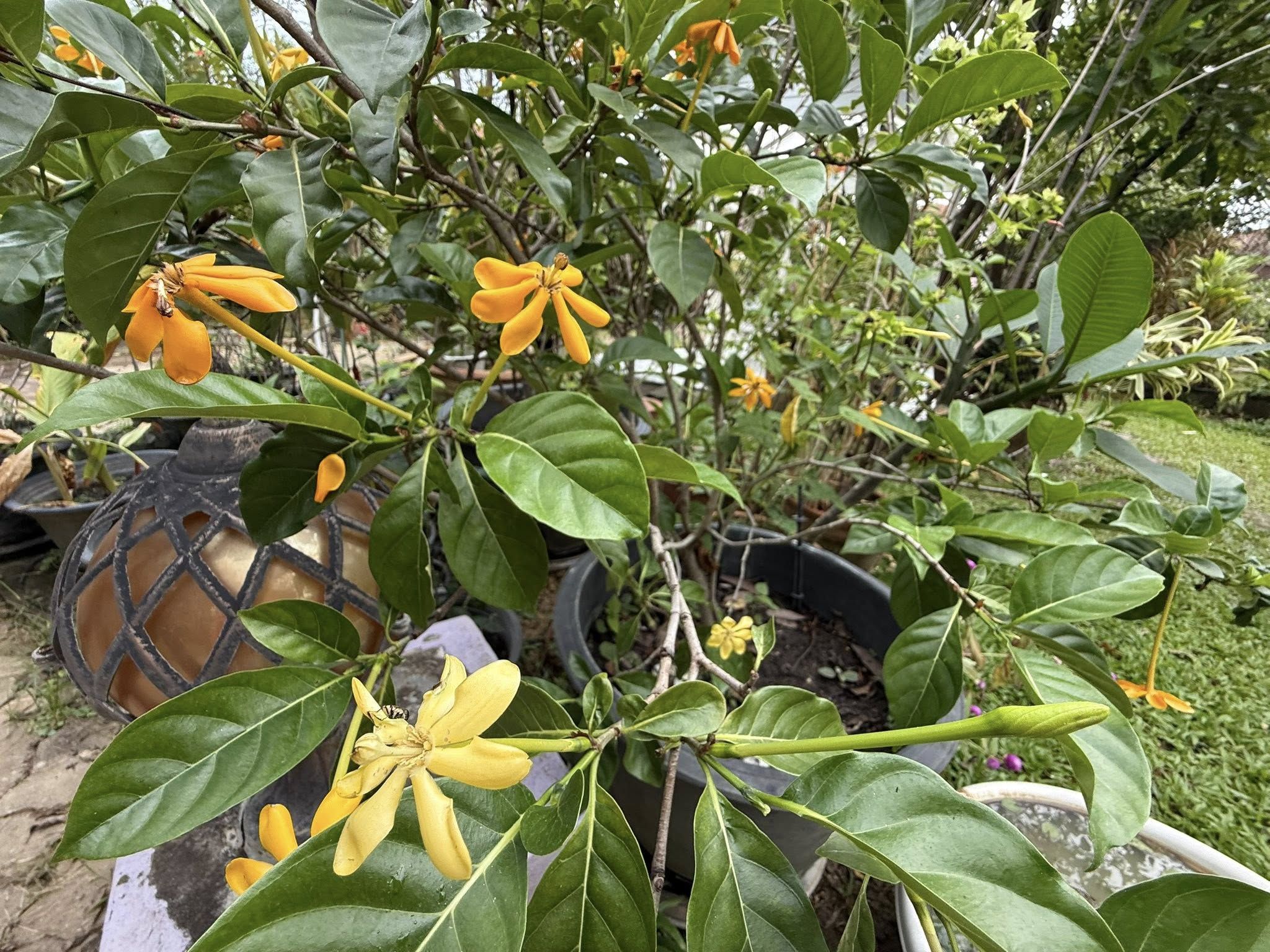 พุดน้ำบุษย์ ไม้ดอกสีเหลือง กลิ่นหอมสุด ไม้อีกชนิดหนึ่งที่ชอบ ต้นที่สวยงามออกดอกเต็มต้น เหลืองอร่ามสวยไม่แพ้ใคร การเลี้ยงดูไม่ยากนัก ต้นนี้ซื้อมาเล็กๆไม่ถึงร้อย ชอบซื้อหุ้นราคาพาร์ เลี้ยงโตแน่นกระถาง เปลี่ยนกระถางใหญ่ขึ้นไปเรื่อยๆ ตอนนี้น่าจะกระถางใหญ่สุดแล้ว เช้านี้ให้ดอกสวยงาม เต็มต้น ลักษณะดอกสวยสมบูรณ์ ดอกใหญ๋ก้านยาวแข็งแรง เด็ดไปไหว้พระ สวยหอมไปอีก แรกบานวันแรกสีขาว สีจะเริ่มเหลืองเข้มขึ้นเรื่อยๆจนกว่าจะร่วยโรย ..เปลี่ยนสี..ชอบ