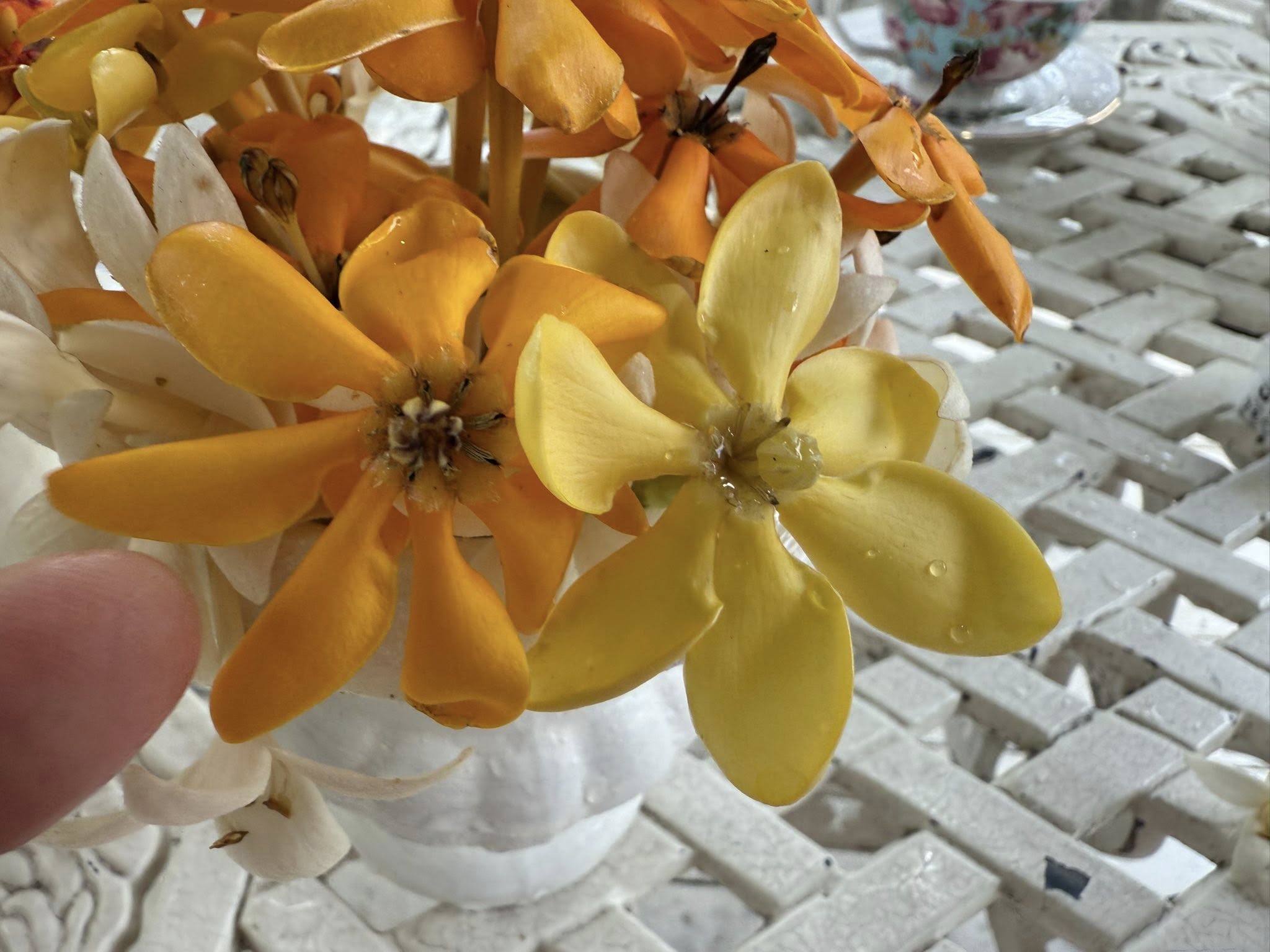 ดอกพุดน้ำบุษย์ และ ดอกอโศกน้ำ ปักแจกันไหว้พระ สวยงามเข้ากับสีจวร กุหลาบที่บ้านสวนเชียงใหม่ ดอกตรึม