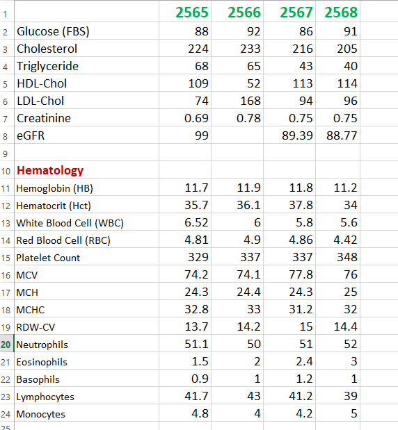 ตอนที่เริ่มเก็บตัวเลขจริงจังคือ 2565-2566 คอเลสเตอรอลรวมสูงมาก หมอจะให้กินยาแล้วล่ะค่ะ เราบอกหมอขอคุมอาหารเองก่อน เราว่าอาหาร นอกจากมีผลต่อน้ำหนักแล้ว คอเลสเตอรอลนี่เห็น ๆ เลย you are what you eat นี่ใช่เลยค่ะ