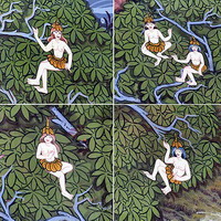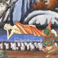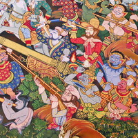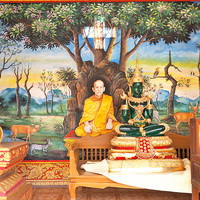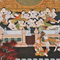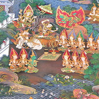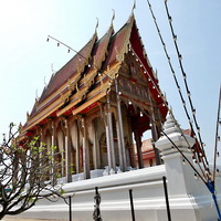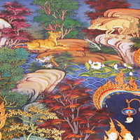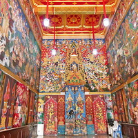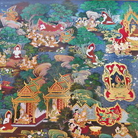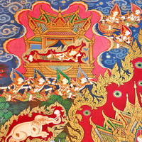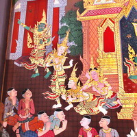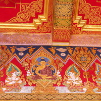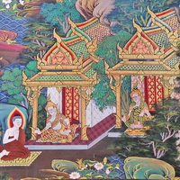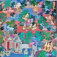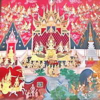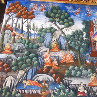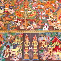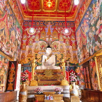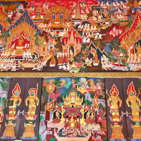Location: On the bank of Bang Ban Canal, on the Local Road no.4016, Tambon Phra Khao, Amphoe Bang Ban, Ayutthaya. Location of murals: Bot (the main temple). Stories: On the wall behind the Buddha, one can find the universe according to Trai Phum (The 3 Worlds) above scenes from Himmapan (Imaginary Magical Forest). Opposite is the Buddha’s Victory over Mara. On the side walls above windows, one can find the previous Buddhas above the Buddha Story. Between windows are the Buddha’s Ten Previous Lives. There are also guardian angels on doors and Ramayana monkeys and giants on windows. | | | |