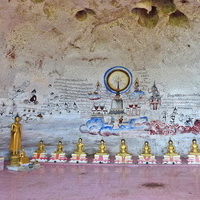 Thum Phra (Buddha’s Cave), Phatthalung | Location: On Rural Road no. 1017, Mu 3, Tambon Khao Chaison, Amphoe Khao Chaison, Phatthalung. Location of murals: Inside the cave. Stories: Downstairs one can find the Buddha Story and Phra Malai preaching in Hell. Upstairs, there are paintings of the Buddha statues, the Buddha in Heaven, Phra Malai in Heaven and one scene from Ramayana. | | | |