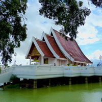 สำหรับอุโบสถกลางน้ำนั้นสร้างขึ้นเมื่อ พ.ศ. ๒๕๒๘ โดยการอุปถัมภ์ของนายขรรค์ชัย บุนปาน เจ้าของ สำนักพิมพ์มติชน โดยมีนายบุญนิยม สิทธิหาญเป็นสถาปนิกผู้ออกแบบ และนายช่างเถา พัฒนโภสินเป็นช่างก่อสร้าง ภายในมีจิตรกรรมฝาผนังรูปต้นพระศรีมหาโพธิ์ฝีมือนายอังคาร กัลยาณพงศ์ ศิลปินแห่งชาติผู้ล่วงลับ ส่วนภาพจิตรกรรมส่วนอื่นๆ นั้นเป็นฝีมือของนางสาวภาพตะวันและนางสาวกาบแก้ว สุวรรณกูฎและคณะเมื่อ พ.ศ. ๒๕๓๕ |