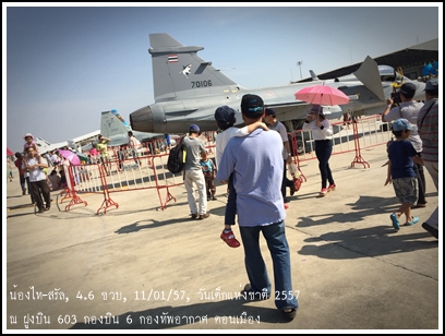 วันเสาร์ที่ 11 มกราคม 2557 วันนี้ ของดเรียนว่ายน้ำ เพราะน้องไทอยากไปดูเครื่องบินครับ พ่อหนุ่มได้เตรียมหากำหนดการไว้เรียบร้อย ปีนี้น้องไทมาเที่ยวงานวันเด็กแห่งชาติ ที่ ฝูงบิน 603 กองบิน 6 กองทัพอากาศดอนเมือง ปีที่สองแล้วครับที่พ่อกับแม่พามาที่นี่
