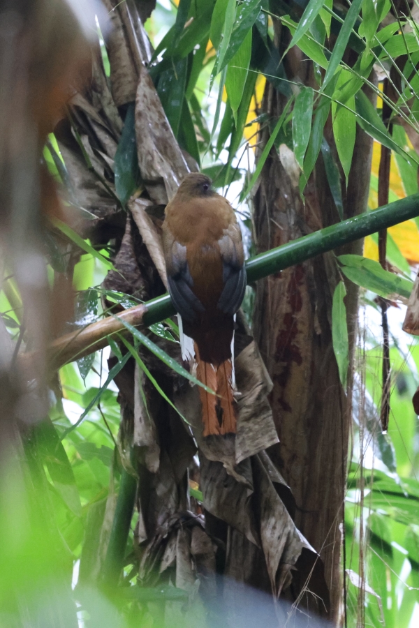 หมอกเริ่มมาเหมือนฝนจะตก เราก็ยังคงเดินต่อไปเห็นฝรั่งที่มาเดินดูนก ที่เจอตั้งแต่จอดรถเอาของเข้าที่พัก เขาชี้บอกว่า เจอ red-head trogon หรือ นกขุนแผนหัวสีแดง เป็นนกที่มีสีสวยงาม ขนาดตัวราว 34 ซ.ม. เพศผู้มีหัวและท้องสีแดงเข้ม หลังสีน้ำตาล ปีกมีลายขวาง สีขาวดำ เพศเมียมีท้องสีแดงอ่อนกว่า หัวสีน้ำตาล ทั้งสองเพศมีใต้หางเป็นลายสีขาวสลับดำ มีชื่อวิทยาศาสตร์ว่า Harpactes erythrocephalusจำแนกโดย John Gould ในปี 1834 จากตัวอย่างที่ได้มาจากย่างกุ้ง กระจายตัวตั้งแต่เนปาล ภูฏาน บังคลาเทศ พม่า จีนตอนใต้ไปจนถึงตะวันออก เกาะไหหลำ อินโดไชนา ไทย มาเลเซีย ไปจนถึงเกาะสุมาตรา เกาะอยู่ตามต้นไม้ไม่สูงนัก เพราะรอจับแมลงกินเป็นอาหาร มักหากินเป็นคู่ เราเลยถ่ายได้มาครบทั้งสองเพศ อาศัยตามป่าดิบเขาที่ความสูงราว 400-2000 เมตร หากยังจำกันได้ ในตอนเช้าหน้าที่ทำการ เราเขียนถึงนกขุนแผน นกที่ชื่อเดียวกัน แต่อยู่กันคนละวงศ์เลย โดยนกขุนแผนอยู่ในวงศ์อีกา (corvidae) มันจึงเป็นนกที่ฉลาด เรียนรู้และปรับตัวเข้ากับมนุษย์ได้ง่าย