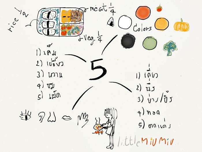 1) สีขาว = ข้าว ขนมปัง หอมใหญ่ ไข่ 2) สีแดง (ส้ม ชมพู) = มะเขือเทศ แครอท ซอสมะเขือ 3) สีเขียว = สารพัดผัก ถั่ว 4) สีทอง(น้ำตาล-เหลือง) = เนื้อสัตว์ ไส้กรอก ข้าวโพด ซอส 5) สีดำ = สาหร่าย/เนื้อสัตว์/งา