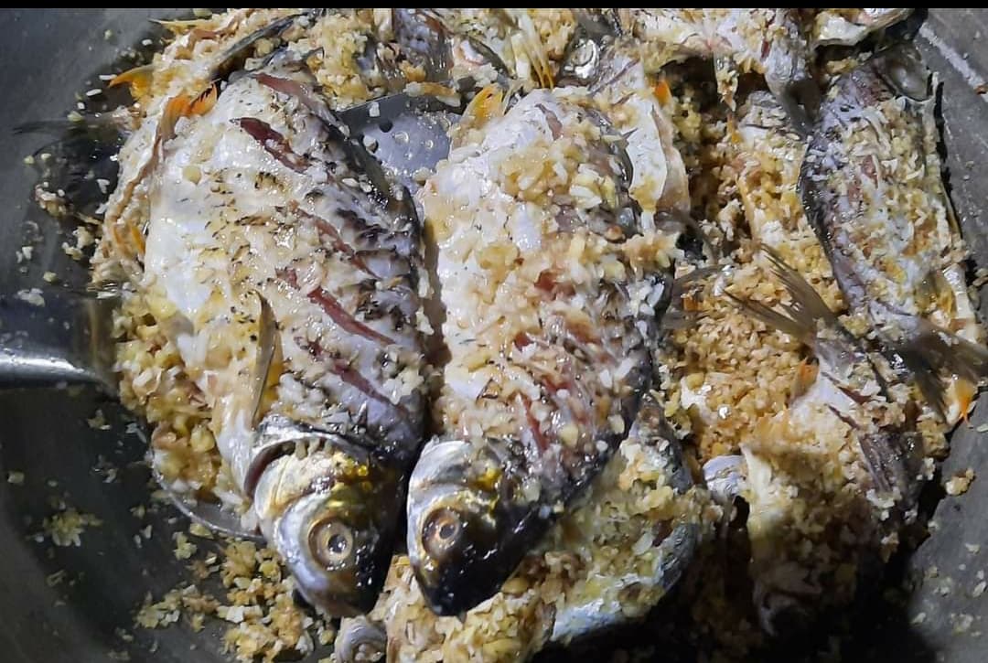 - ใส่กระเทียมจีนโขลกหยาบ ตามด้วยน้ำตาลทราย ผงชูรส ผงปรุงรส คลุกเคล้าให้เข้ากันกับตัวปลา