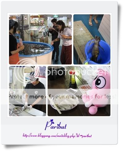 หลังจากคุณน้องขา ตกมาได้ตัวหนึ่ง คุณพี่ขาก็ตกตามมามั่ง (แต่แอบโลภค่ะ.. เลือกตัวใหญ่ที่สุด) ปรากฏว่า..เปียกไปครึ่งตัว.. เพราะปลาหมึกมันพ่นน้ำใส่ตอนยกมันขึ้นมาจากอ่าง .. จากนั้นเอาปลาหมึกตัวนั้นไปให้ชายหนุ่มมือแล่.. แล่เป็นชิ้น ๆ .. ใส่จาน ก่อนนำไปหม่ำจิ้มกับซอสโซยุ กะ วาซาบิ..