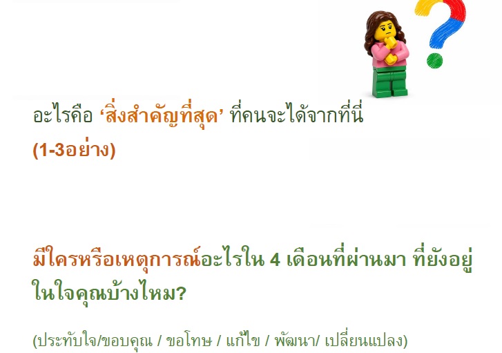 เมื่อการบริหารจัดการงานและชีวิต มีหลายเรื่อง ในคำถามที่ช่วยให้ผู้เข้าร่วมได้วางแผนการลงมือทำจริง ผู้เข้าร่วมจึงต่อเลโก้เพื่อวางแผนเรื่องต่างๆที่จะทำโดยลำดับความสำคัญ หรือเปอร์เซนต์