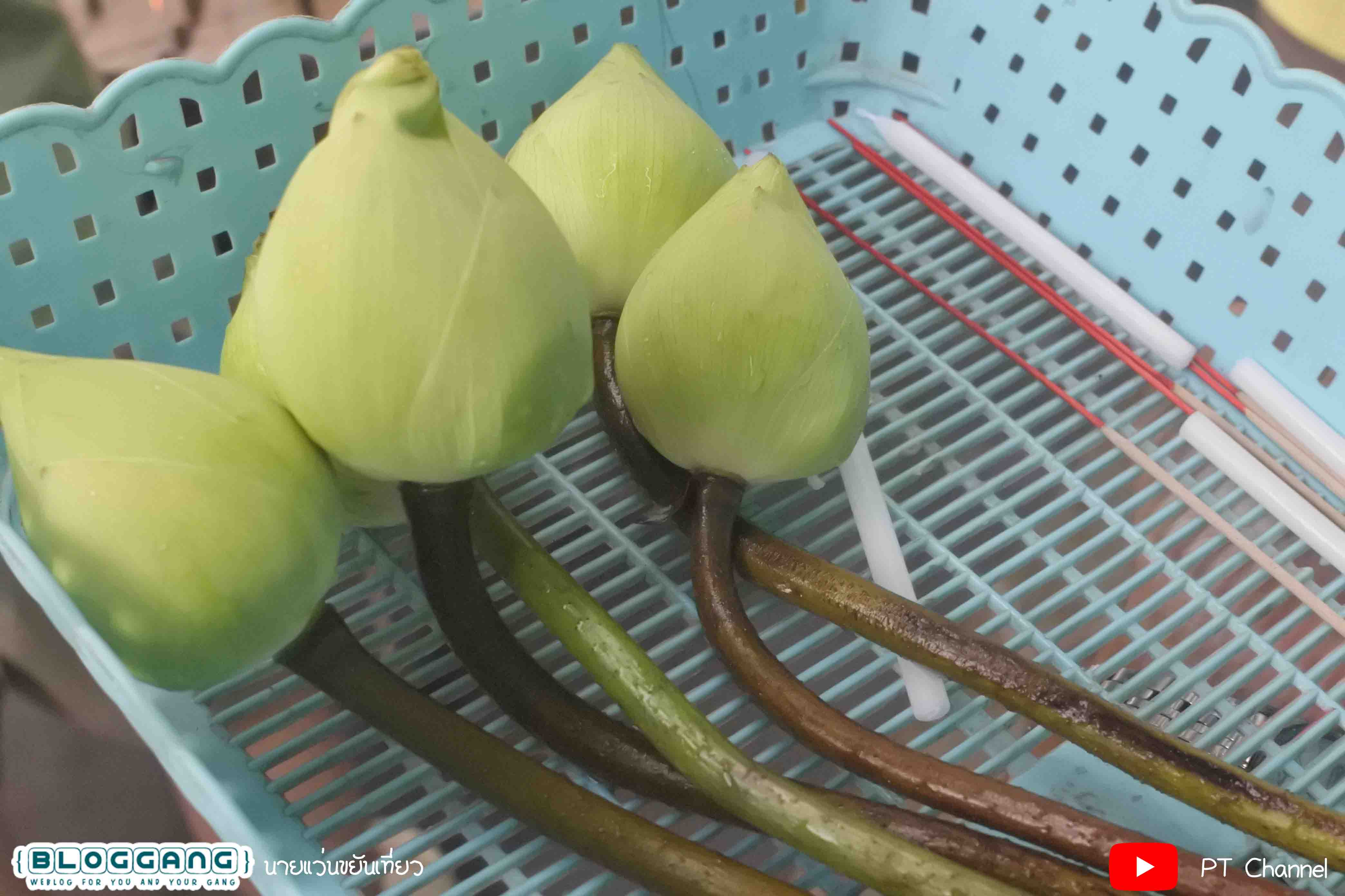 ดอกบัว 5 ดอก ธูป 5 ดอก เทียนสีขาว 5 เล่ม เงินใส่ถาด 5 บาท