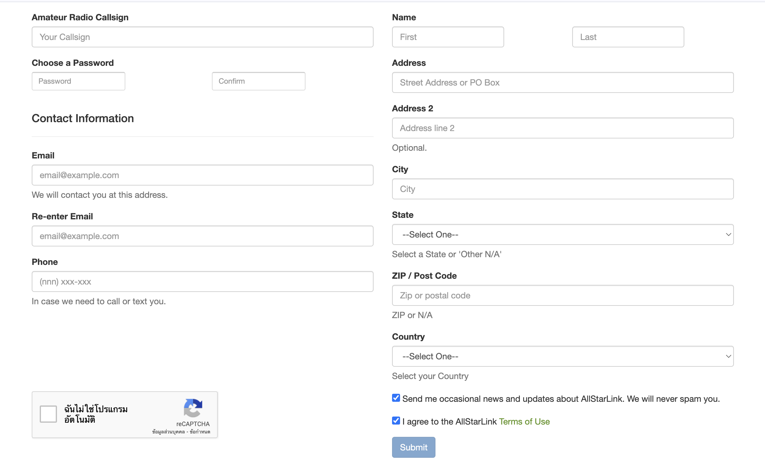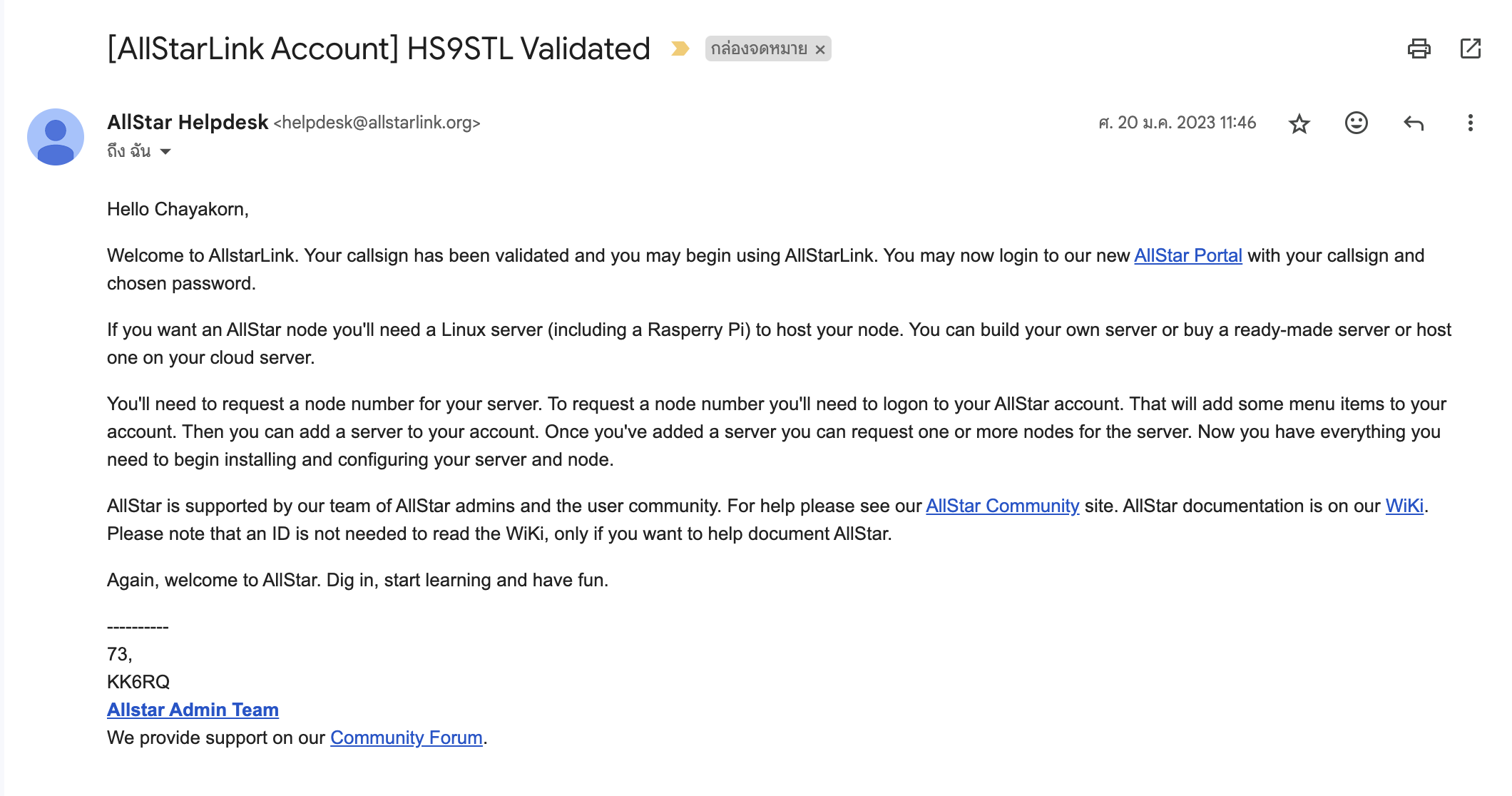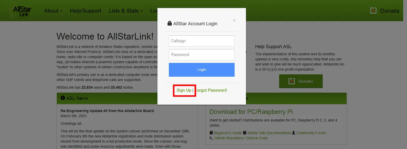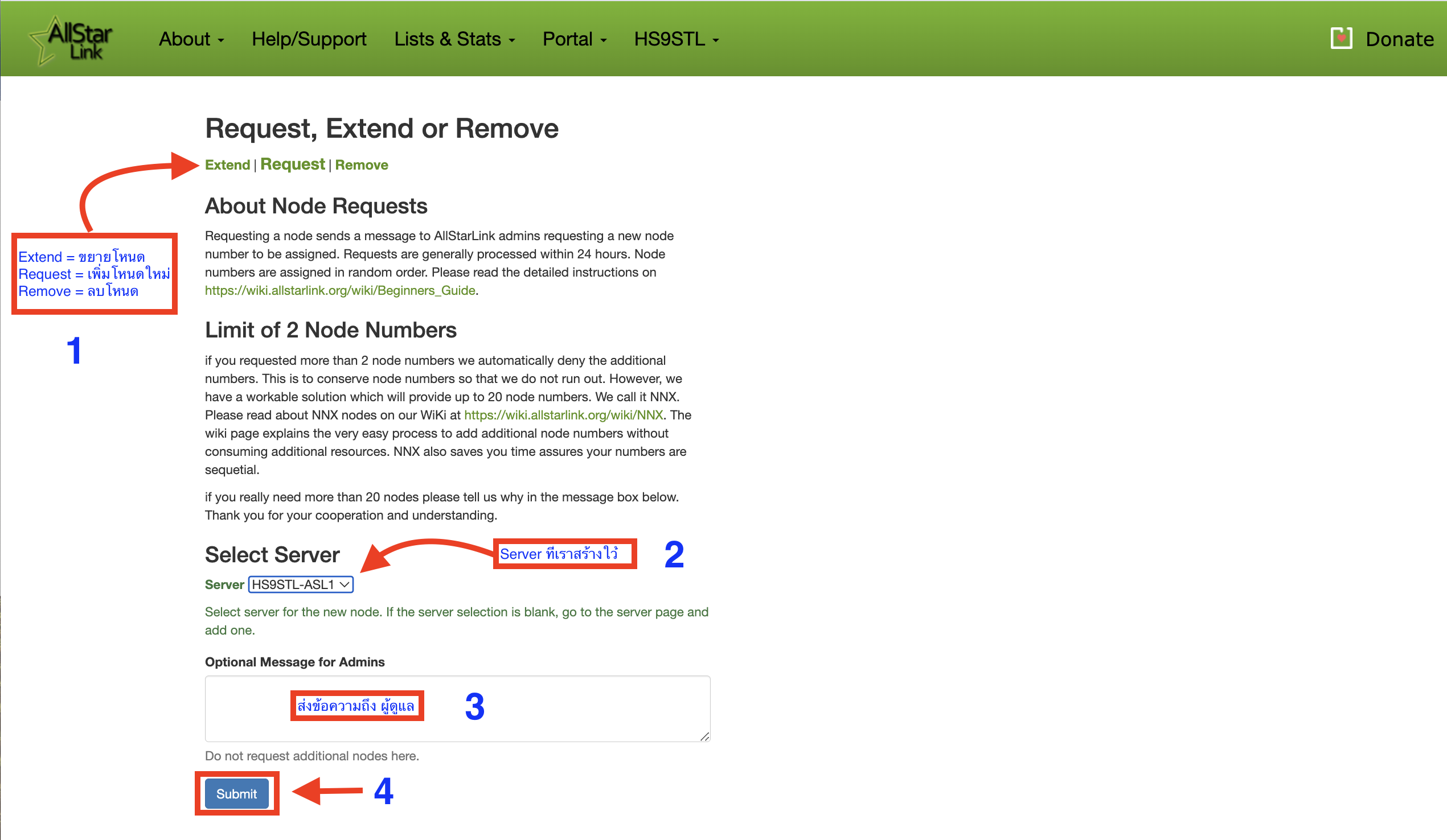 สำหรับผุ้ที่ต้องการใช้งาน Allstarlink ให้เริ่มศึกษาการใช้งานและเริ่มลงทะเบียนในเวป https://www.allstarlink.org เข้าสู่หน้าเวปแล้วให้ เริ่มลงทะเบียนโดยกดที่ Login/Sign Up มีหน้าต่างขึ้นมาให้กด Sing Up เพื่อลงทะเบียนหลังจากนั้นให้กดที่ Begin Registrationเริ่มกรอกข้อมูลต่างๆ สร้างรหัสผ่าน ของเราเอง และกด Submitเมื่อกรอกข้อมูลครบถ้วนแล้ว ระบบจะส่ง e-mail ยืนยัน ให้เข้ายืนยันใน mail box ที่ลงทะเบียนหลังจากคลิ๊ก Link ยืนยันแล้วหน้าเว็บของ AllstarLink จะมีข้อความแจ้งว่าให้รอการตรวจสอบใน 24 ชั่วโมง ซึ่งเราต้องรอ e-mail ตอบกลับก่อนจึงจะทำขั้นตอนอื่นได้หลังจากนั้นจะมี mail ตอบกลับยืนยันอนุมัติกลับมาหลังจากที่เราได้รับตรวจสอบการลงทะเบียนเรียบร้อยแล้ว ให้เข้าหน้าเวป https://www.allstarlink.orgเพื่อ Login เข้าสู้ระบบเพื่อจัดการ server และ node ของตัวเอง ต่อไปใช้ Callsign และ Password ที่ลงทะเบียนใว้ตอนต้นเมื่อ Login เข้าระบบได้แล้ว เข้าสู้การจัดการ Server และ Node กดปุ่ม Proceed with Server Setup เพื่อสร้าง Server ของเราเองป้อนข้อมูลต่าง ๆ ของ Server รวมไปถึงพิกัดตำแหน่งที่ตั้งของ Server ตามความเป็นจริงต่อไป รวมถึง พิกัด จาก Mapกด Submit เป็นการสร้าง Server รองรับ Node เสร็จแล้ว หลังจากนั้น ไปสร้าง Node กันต่อโดยการกด ไปที่เมนู Portal ---> Node Settings เพื่อสร้าง Node ต่อไปเมื่อกดเข้าที่ Node Settings แล้ว ให้กด Continue.. เพื่อขอสร้าง Node ใหม่หลังจากนั้น เลือก สร้าง Node ใหม่ เลือก Server ที่สร้างใว้ และเขียนเหตุผลที่ต้องการสร้างเช่น I want to study and use Allstarlink. (ฉันต้องการศึกษาและใช้งาน Allstarlink)เมื่อกด Submit แล้วเราจะได้ Node แรกขึ้นมาใช้งาน ซึ่งจะได้เป็นตัวเลข Node ของเราเมื่อได้เลข Node ของเราแล้ว ให้ง่ายต่อการตั้งค่า เราควรเข้าไปแก้ไข password nodeโดยกดที่เลข node เมื่อแก้ไข password และข้อมูลอื่นแล้วให้กด submit เพื่อยืนยันหลังจากนั้นให้เรา จำเลข node และ password node ที่ตั้งค่าใว้เพื่อใช้งานต่อไปขั้นตอนต่อไป สำหรับตั้งค่าใช้งานใน PoC หรือ Smartphone (Android)Download ติดตั้ง App DVSwitch Mobileเมื่อติดตั้งเสร็จแล้ว เปิด app เลือก เมนู Accounts เพื่อตั้งค่าตั้งค่า Accounts ของเราเอง โดยกดเลือก IAX2 ขึ้นมา 1 บรรทัดโดยการใส่ เลข node และ password node ของเราที่สร้างขึ้นหมายเหตุ.. เริ่มต้นให้ตั้งค่า ระดับ Tranmit Level ใว้ประมาณ 50% เสร็จแล้วกด Saveขึ้นหน้าจอแบบนี้แสดงว่า เรา Login node เราได้แล้วขั้นตอนต่อไป ใส่เลข node ปลายทางที่ต้องการติดต่อเช่น 59436 node E25LG Repeater HS9ASกด Connect เพื่อเชื่อมต่อเมื่อเชื่อมต่อสำเร็จ สามารถพูดคุยโดยการกดปุ่ม PTT ที่หน้าจอหรือ PTT สำหรับ PoCขอให้สนุกกับการใช้ระบบ และขอให้ ให้เกียรติทุกคนที่ใช้ระบบร่วมกัน.....ขอบคุณครับ.....By_PoM_HS9STL