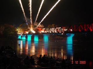 เราตกลงใจเลือกนั่งที่ร้านอาหารแห่งหนึ่งริมแม่น้ำ จองที่ติดระเบียงสุดๆ เพื่อที่จะไม่มีอะไรมาบังวิวเราได้ การแสดงเริ่มด้วยการเล่าประวัติความเป็นมาของสะพานข้ามแม่น้ำแคว ความโหดร้ายต่างๆในสงครามโลกครั้งที่สอง ที่มาของชื่อที่ทั่วโลกต่างเรียกว่า The death railway หรือ ทางรถไฟสายมรณะ...