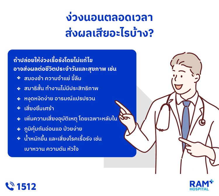 ง่วงนอนตลอดเวลา ส่งผลเสียอะไรบ้าง? ถ้าปล่อยให้ง่วงเรื้อรังโดยไม่แก้ไข อาจส่งผลต่อชีวิตประจำวันและสุขภาพ เช่น - สมองช้า ความจำแย่ ขี้ลืม