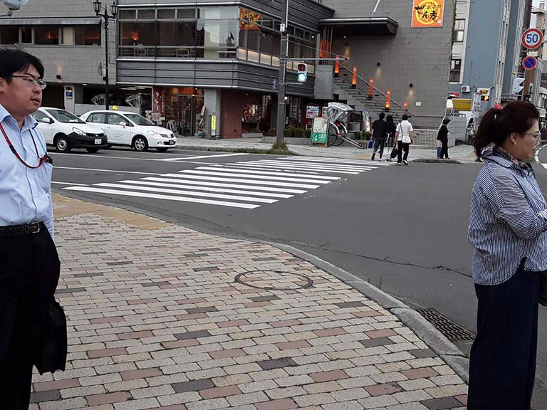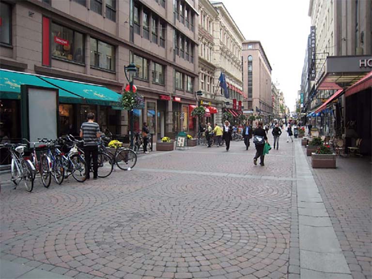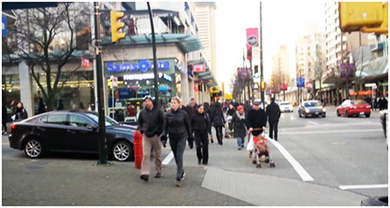 การออกแบบปรับปรุงผิวทางเดินและทางข้ามของเมืองแวนคูเวอร์เพื่อสร้างความปลอดภัยสำหรับคนเดิน ที่มา: ฐาปนาบุณยประวิตร (กุมภาพันธ์: 2557) ผลประโยชน์ด้านเศรษฐกิจ เขาได้นำผลการศึกษาพฤติกรรมของคนในGen-Mหรือประชากรที่มีอายุระหว่าง 18-24ปีหรือผู้ระหว่างการศึกษาระดับปริญญาโทหรืออยู่ในช่วงเริ่มต้นทำงานซึ่งระบุว่าคนใน Gen-M ต้องการอยู่อาศัยในย่านพาณิชยกรรม (downtown)หรือในบริเวณชั้นในของเมืองมากกว่าย่านชานเมือง(สอดคล้องกับผลการวิจัยหลายๆ ชิ้นที่ Smart GrowthThailand เคยนำเสนอไปแล้ว)เนื่องจากต้องการที่อยู่อาศัยใกล้เคียงที่ทำงาน ใกล้เพื่อน ใกล้สถานบันเทิงใกล้ตลาดสดหรือร้านค้าปลีกซึ่งปัจจัยเหล่านี้จัดเป็นเครื่องกระตุ้นเศรษฐกิจในบริเวณศูนย์พาณิชยกรรมใจกลางเมือง ผลประโยชน์ด้านสุขภาพ เขาได้นำเอาผลการศึกษาจากหลายๆแหล่งที่ยืนยันถึงผลประโยชน์จากการเดินซึ่งเป็นกิจกรรมทางกายที่ช่วยลดภาวะโรคอ้วนอันเป็นต้นเหตุของโรคภัยไข้เจ็บต่างๆ โดยสรุปได้ว่า ในพื้นที่เมืองที่เน้นการเดินหรือ walkable city จะเป็นพื้นที่มีมลพิษทางอากาศน้อยกว่าเมืองที่เน้นการใช้รถยนต์หรือautomobilecity เช่นเดียวกับโอกาสในการเกิดอุบัติเหตุซึ่งเมืองประเภทแรกมีน้อยกว่า ผลด้านสภาวะแวดล้อม เมืองแห่งการเดินจะเป็นเมืองที่ประหยัดการใช้พลังงงานเป็นเมืองที่ลดโลกร้อน และสร้างสรรค์สภาพแวดล้อมที่่น่าอยู่ การสร้างกายภาพเมืองเพื่อส่งเสริมการเดิน Jeff Speck ได้แสดงบันได 4 ขั้นในการสร้างเมืองแห่งการเดินหรือ WalkableCities ไว้ดังนี้ 1. เมืองควรสร้างเหตุแห่งการเดินและเหตุแห่งการพัฒนา เขาบอกว่านักผังเมืองไม่ควรคิดเพียงแค่ว่าจะส่งเสริมการเดินระหว่างบ้านไปยังที่ทำงานเท่านั้น แต่ต้องให้ความสำคัญกับการปรับเปลี่ยนพื้นที่ที่ก่อให้เกิดความสมดุลระหว่างการเดินกับการใช้งานนั่นก็หมายถึง ต้องมีความพยายามในการสร้างพื้นที่ให้เกิดการผสมผสานการใช้ประโยชน์ในย่านที่อยู่อาศัยที่ทำงาน ร้านค้าปลีก สถานบันเทิง และอื่นๆ ให้พื้นที่เหล่านี้เป็น walkableที่สมบูรณ์ 2. สร้างทางเดินที่ปลอดภัย ข้อนี้มีความสำคัญมาก แต่มีการกล่าวถึงน้อย ขนาดของแปลงที่ดินที่ต้องมีขนาดไม่ใหญ่เกินไปและการเพิ่มความปลอดภัยบนทางเดินให้มากขึ้น 3. สร้างทางเดินให้มีความสะดวกสบาย ออกแบบสถานีจอดรถให้อยู่ใจกลางของแปลงที่ดิน ปรับปรุงกายภาพทางเดินให้งดงามด้วยต้นไม้ สวนหย่อมและดูแลสภาพหน้าร้านให้มีความสมบูรณ์ 4. สร้างทางเดินให้มีความเป็นเอกลักษณ์น่าสนใจ อาจจะมีความเหมือนหรือแตกต่างกันก็ได้ ขึ้นอยู่กับยุทธศาสตร์ของเมืองที่ได้ก