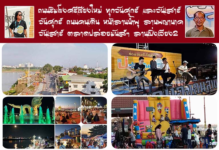 กิจกรรมดนตรีสัญจร ถนนคนเดิน ลานพญานาค ริมโขง อ.ศรีเชียงใหม่ จ.หนองคาย ทุกวันศุกร์เริ่ม 15.00 น. มีวัฒนธรรมสองล้าน สองเวียง ผสมผสาน และมีปูเสื่อ ให้พี่น้อง และนักท่องเที่ยว นั่งรับประทานอาหารบนทำเลที่ดีที่สุดย่านหนึ่งของริมแม่น้ำโขง