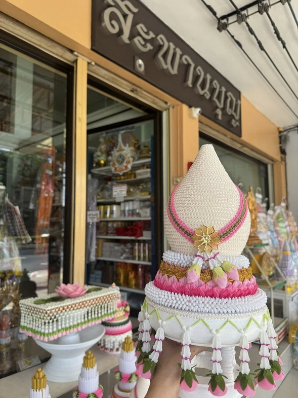 ที่ตกแต่งด้วยดอกไม้พลาสติก ดอกรัก ดอกพุด ลูกปัดสีสัน ลูกปัดทอง หรือดอกมะลิ บัวศิลปชีพ ผ้าเพชร เพื่อใช้ในงานบวชและงานทอดกฐิน