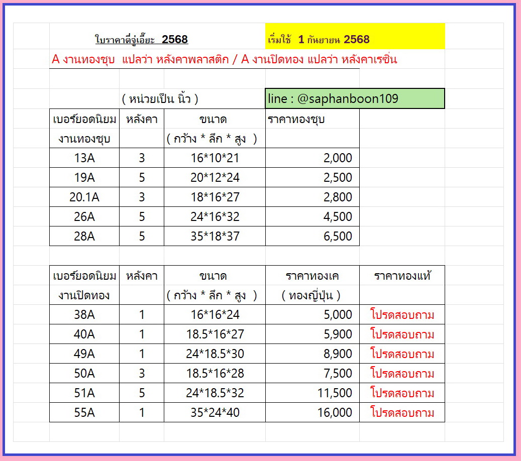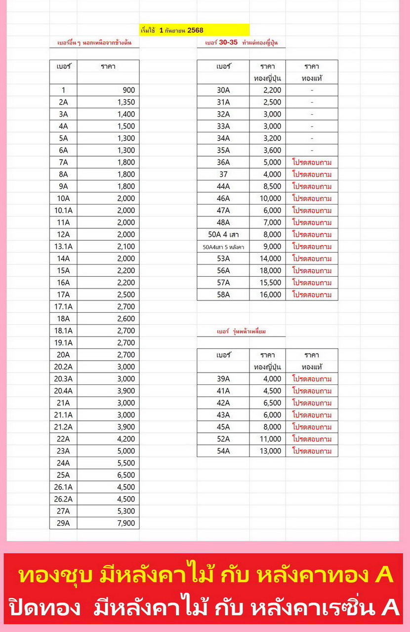 ( เบอร์ยอดนิยมทองชุบคือ 13, 19 , 20.1 , 26 )