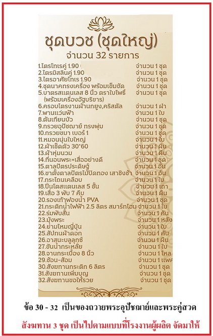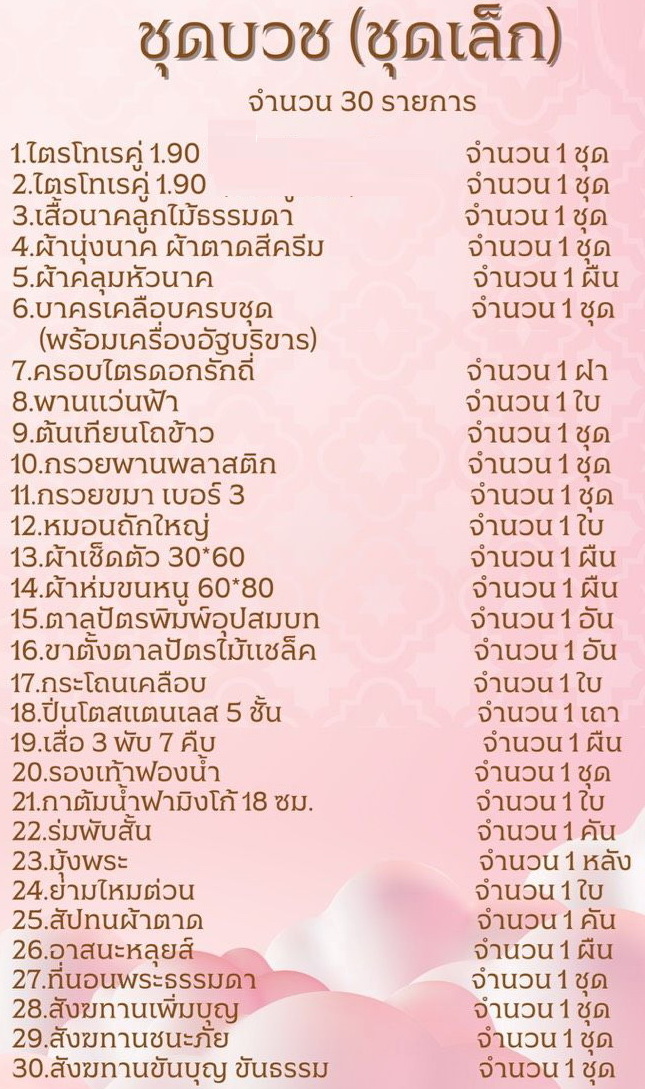 หมายเหตุ - คำว่า ครบชุดบวชขนาดเล็ก ใหญ่ ของแต่ละคนไม่เท่ากัน สอบถามเพิ่มเติม ติดต่อ ร้านสะพานบุญได้ค่ะ