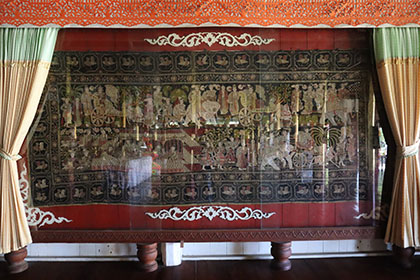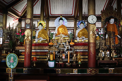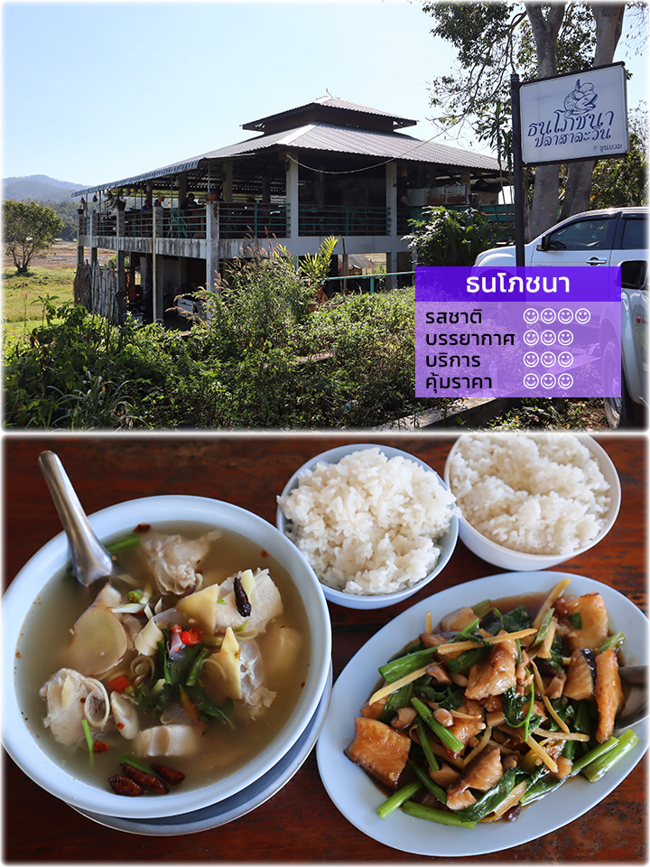 เที่ยงนี้กินร้านดังของขุนยวม ร้านธนโภชนา ที่เต็มไปด้วยเมนูปลาจากลุ่มน้ำสาละวินที่ไหลจากเทือกเขาหิมาลัยผ่านจีน พม่า ไทย และไหลลงมหาสมุทรอินเดีย โดยมีลุ่มน้ำสาขาคือแม่น้ำปาย แม่น้ำยวม และแม่น้ำเมย ปลาหลายชนิดไม่ค่อยคุ้นเคยในแม่น้ำภาคกลาง อย่างปลาคม ปลาหมู ปลาแข้ ส่วนปลาอื่นๆ อย่างปลาคัง ปลาทับทิม ก็มีนะครับ มื้อนี้สั่งต้มยำปลาคม กับผัดคื่นช่ายปลาแข้ อร่อยทั้งสองอย่าง วิวร้านเห็นทุ่งนาสวยงาม ถึงคนเที่ยวขุนยวมจะน้อย แต่ร้านนี้รถจอดกันเยอะเลยครับ ดังจริง ออกจากตัวเมืองขุนยวมไปที่บ้านต่อแพ ที่นี่เป็นชุมชนไทใหญ่เก่าแก่ และยังมีที่เที่ยวที่น่าสนใจอย่าง วัดต่อแพ ซึ่งชาวไทใหญ่บูรณะจากวัดร้างที่เหลือแต่ซากเจดีย์สร้างเป็นสำนักสงฆ์ขึ้น และพ่อค้าชาวจีนที่มาต่อแพบริเวณนี้ได้สร้างศาลาการเปรียญของวัดขึ้นในปี พ.ศ.2463