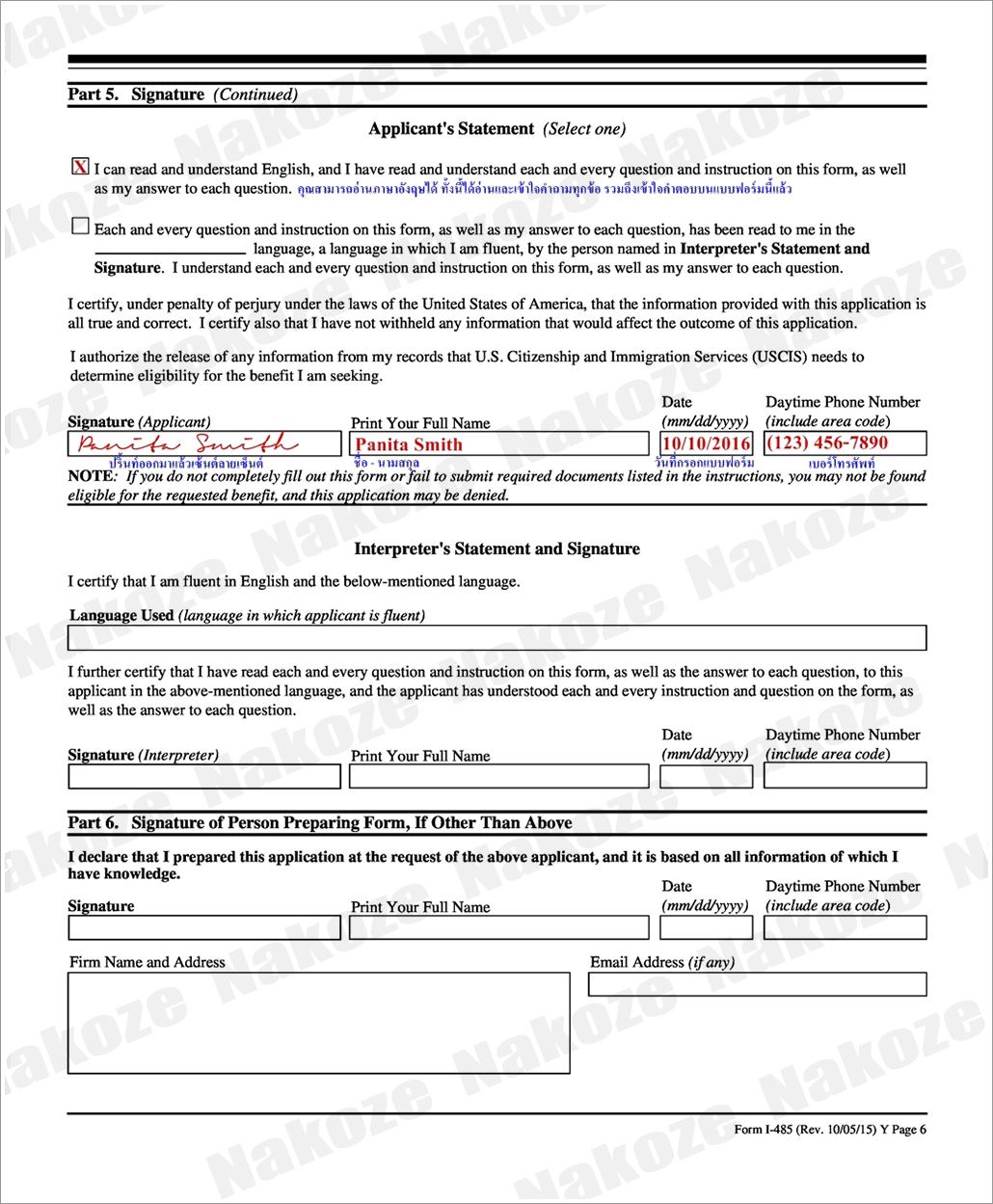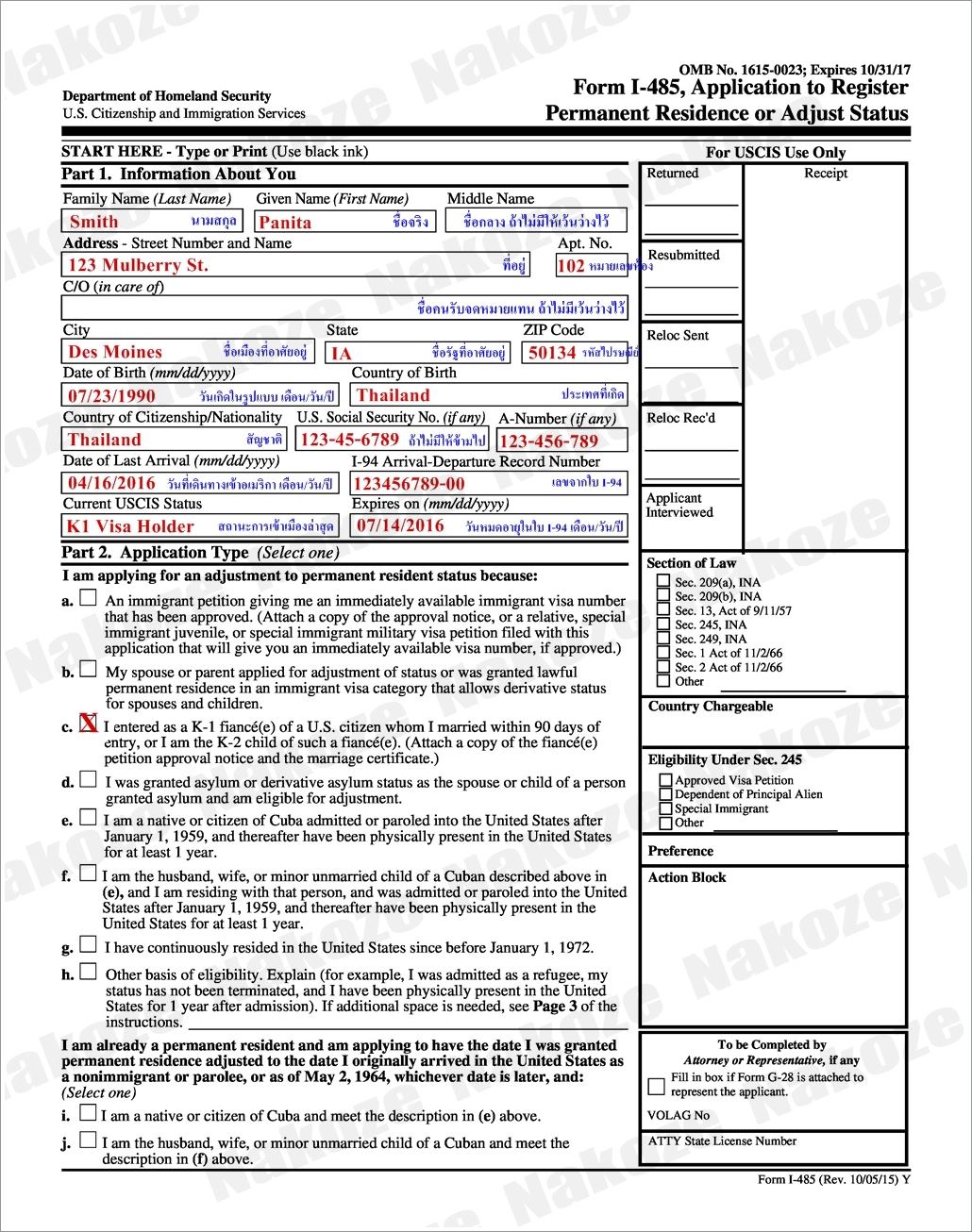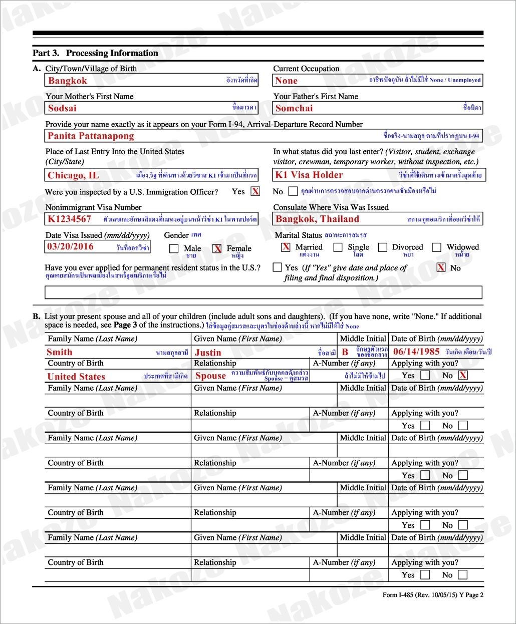 ◄ วิธีการกรอกฟอร์ม I-485 Form I-485 Application to Register Permanent Residence or Adjust Status ก่อนอื่นขอความกรุณาอย่าดาวโหลดแต่รูปภาพไปดูนะคะ กรุณาอ่านข้อมูลตามด้านล่างนี้ประกอบไปด้วยเพื่อกันความผิดพลาด อนึ่งข้อมูลที่ปรากฏในนี้เป็นข้อมูลที่ Nakoze สมมุติทั้งสิ้น บุคคลและที่อยุ่ในข้อมูลนี้ไม่มีตัวตนแต่ประการใดค่ะ Nakoze ขอทำความเข้าใจก่อนนะคะว่าข้อมูลที่ปรากฏด้านล่างนี้ เป็นข้อมูลสำหรับการเปลี่ยนสถานะ(ยื่นขอกรีนการ์ด) โดยผ่านการเข้าประเทศด้วยวีซ่า K1 หญิง-ชายที่สมมุติขึ้นไม่เคยแต่งงานมาก่อน ทั้งสองฝ่ายไม่เคยผ่านการมีบุตร ฝ่ายชายรายได้เกินเกณฑ์การยื่นเอกสารปรับสถานะ ฝ่ายชายเป็น U.S citizen โดยกำเนิดค่ะ ฟอร์ม I-485 Application to Register Permanent Residence or Adjust Status เป็นฟอร์มที่ใช้สำหรับยื่นปรับสถานะที่อเมริกานะคะ ฟอร์มนี้มีทั้งหมด 6 หน้ากระดาษนะคะ ฟอร์มล่าสุดใช้ได้ถึงวันที่ 31 ตุลาคม 2517 ถ้าหากเกินจากวันที่ดังกล่าวแล้วหรือฟอร์มมีการเปลี่ยนแปลง ต้องใช้ความระมัดระวังด้วยตัวเองนะคะ เอาล่ะค่ะ ศึกษาจากรูปภาพก่อนนะคะ มีคำบรรยายอีกทีด้านลา่งภาพค่ะ หน้า 1 ![]() Part 1 เป็นการถามข้อมูลของผู้สมัคร(ตัวเรา)ค่ะ - Family Name : นามสกุล(หากใครเปลี่ยนมาใช้นนามสกุลสามีก็ให้ใส่นามสกุลใหม่ลงไปเลยค่ะ) - Given Name : ชื่อจริง - Middle Name : ชื่อกลาง หากไม่มีให้ข้ามไปค่ะ - Address : ที่อยู่ - Apt. No. : คนที่อยู่อพาร์ทเม้น ตรงนี้คือเลขห้องค่ะ แต่สำหรับใครที่ไม่ได้อยู่อพาร์ทเม้นหรือไม่มีเลขห้องก็ข้ามไปค่ะ - C/O(in care of) : ใช้ในกรณี่คุณให้คนอื่นรับจดหมายแทน ถ้าไม่มีก็เว้นว่างค่ะ - City : ชื่อเมืองที่คุณอาศัยอยู่ - State : ชื่อรัฐที่คุณอาศัยอยู่ - Zip Code : รหัสไปรษณีย์ - Date of Birth : วันเกิด ใส่ในรูปแบบ เดือน/วัน/ปี - Country of Birth : ประเทศที่เกิด - Country of Citizenship/Nationality : ระบุสัญชาติหรือพลเมืองค่ะ - U.S. Social Security No. : เลข SSN 9 หลัก หากยังไม่มีให้ข้ามไปค่ะ - A-number : หมายเลข Alien 9 หลัก ตรงนี้หาดูได้จากในใบ NOA 2 ค่ะ - Date of last Arrival : วันที่ๆเดินทางเข้ามาถึงอเมริกา ในรูปแบบ เดือน/วัน/ปี - I-94 record number : เลข I-94 เป็นตัวเลข 11 หลัก ดูวิธีค้นหา I-94 คลิกที่นี่ - Current USCIS Status : สถานะการเข้าเมือง ณ ปัจจุบัน ซึ่งผู้ถือวีซ่า K1 ตอบ K1 Visa Holder ค่ะ - Expires on : ให้ดูตรงคำว่า Admit until date ในใบ I-94 นะคะ ไม่ใช่บนวีซ่า ดูวิธีค้นหา I-94 คลิกที่นี่ Part 2 : Application Type ประเภทของการสมัคร - ตอบข้อ C คือ เราเข้าเมืองด้วย K1 visa วีซ่าสำหรับคู่หมั้นของ U.S. citizen คนที่เราแต่งงานด้วยแล้วภายใน 90 วัน ---------------------------------------------------------------------------------------------------- หน้า 2 ![]() Part3. Processing Information พาร์ทย่อย A : พาร์ทนี้เป็นข้อมูลของเราต่อนะคะ - City/Town/Village of Birth : จังหวัดที่เกิด - Current Occupation : อาชีพปัจจุบัน (เข้าใจว่าเข้าประเทศแล้วยังไม่สามารถทำงานได้ ให้ใส่ None หรือ Unemployed) - Your Mother's First name : ชื่อของมารดา -
