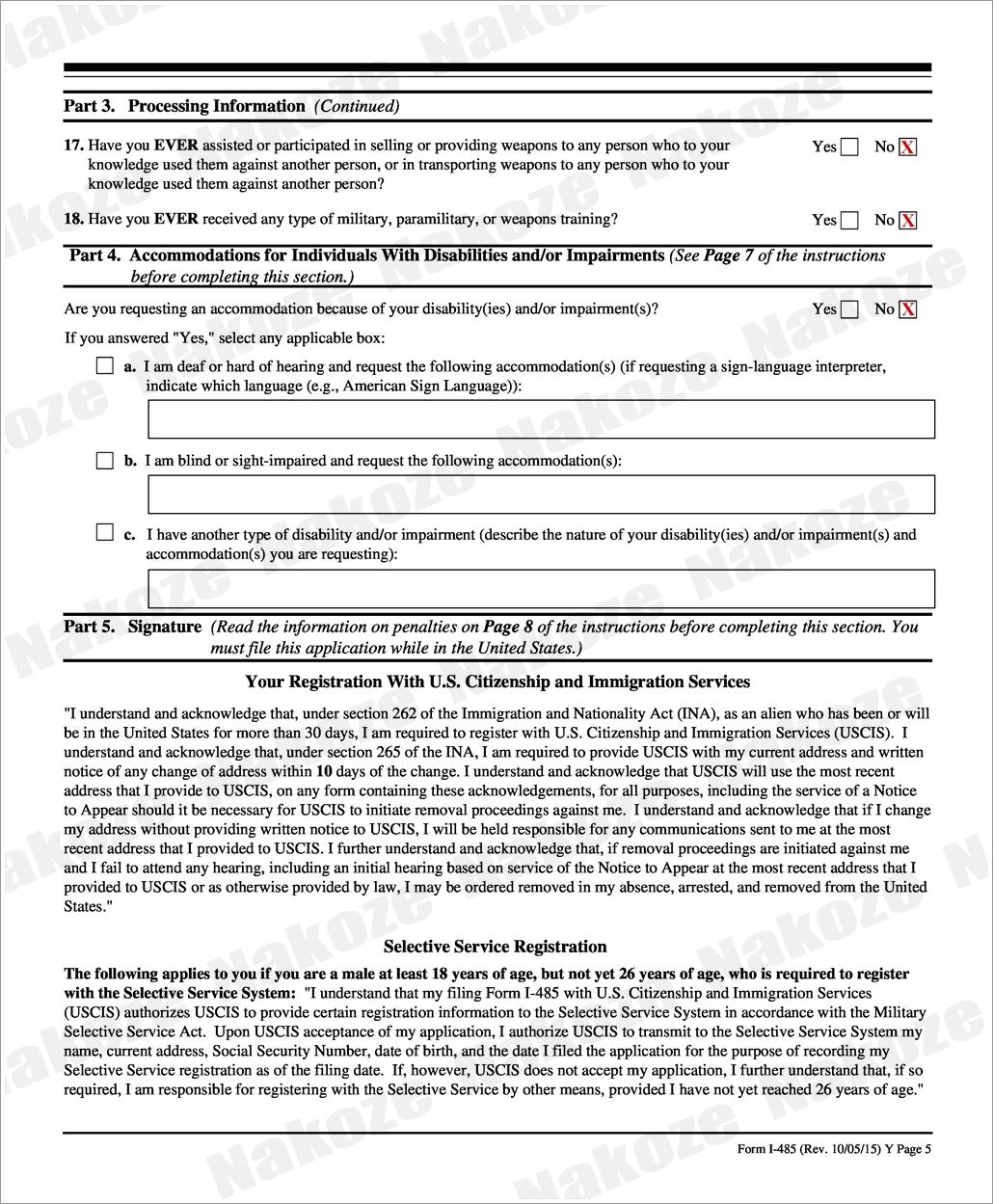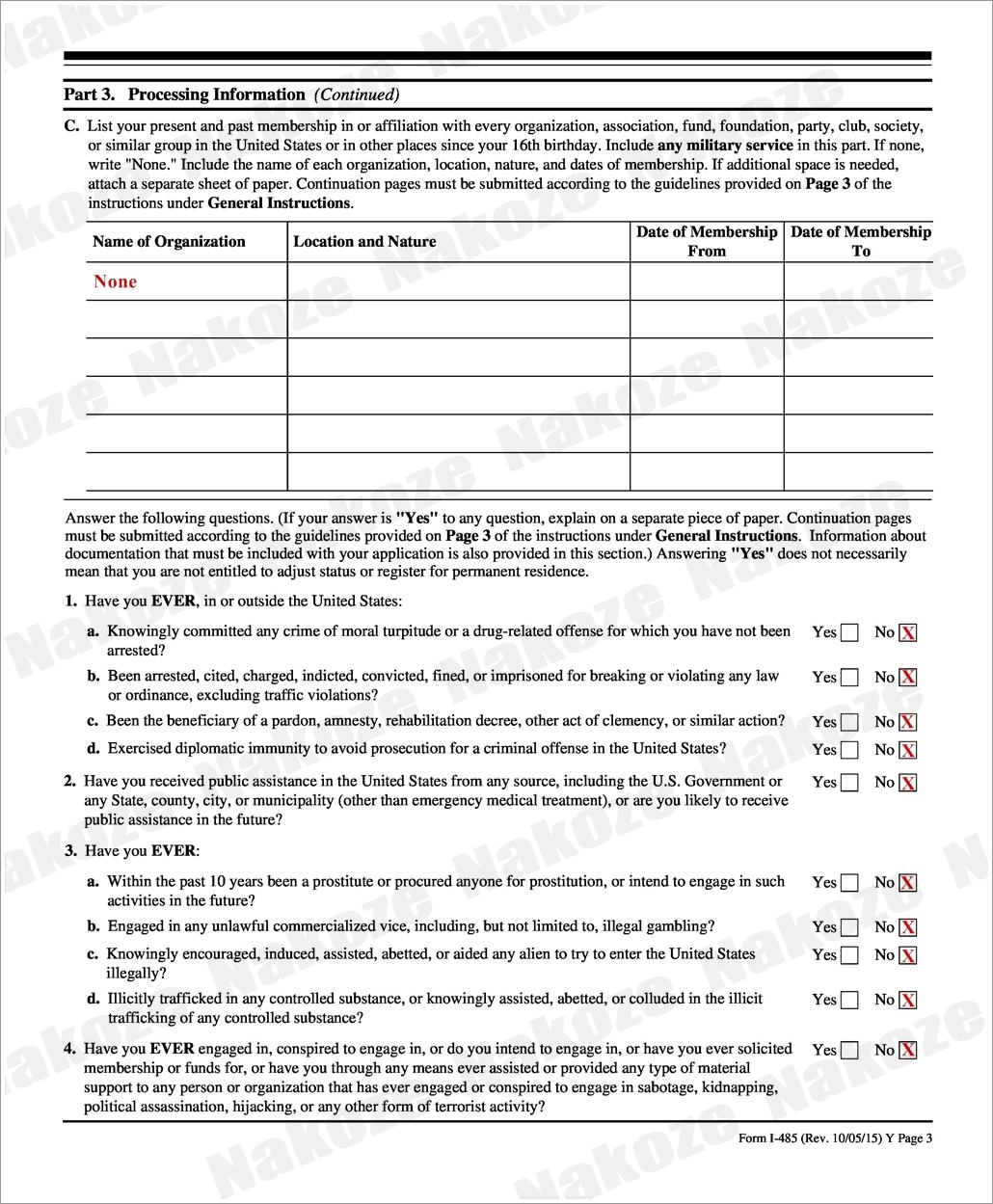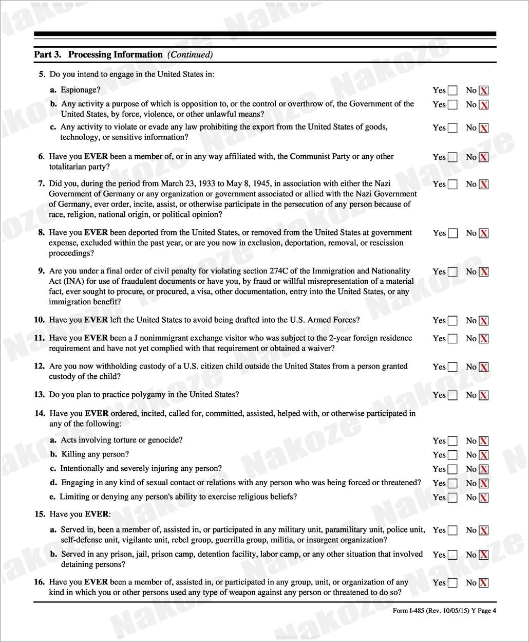 ◄ วิธีการกรอกฟอร์ม I-485 Form I-485 Application to Register Permanent Residence or Adjust Status ก่อนอื่นขอความกรุณาอย่าดาวโหลดแต่รูปภาพไปดูนะคะ กรุณาอ่านข้อมูลตามด้านล่างนี้ประกอบไปด้วยเพื่อกันความผิดพลาด อนึ่งข้อมูลที่ปรากฏในนี้เป็นข้อมูลที่ Nakoze สมมุติทั้งสิ้น บุคคลและที่อยุ่ในข้อมูลนี้ไม่มีตัวตนแต่ประการใดค่ะ Nakoze ขอทำความเข้าใจก่อนนะคะว่าข้อมูลที่ปรากฏด้านล่างนี้ เป็นข้อมูลสำหรับการเปลี่ยนสถานะ(ยื่นขอกรีนการ์ด) โดยผ่านการเข้าประเทศด้วยวีซ่า K1 หญิง-ชายที่สมมุติขึ้นไม่เคยแต่งงานมาก่อน ทั้งสองฝ่ายไม่เคยผ่านการมีบุตร ฝ่ายชายรายได้เกินเกณฑ์การยื่นเอกสารปรับสถานะ ฝ่ายชายเป็น U.S citizen โดยกำเนิดค่ะ ฟอร์ม I-485 Application to Register Permanent Residence or Adjust Status เป็นฟอร์มที่ใช้สำหรับยื่นปรับสถานะที่อเมริกานะคะ ฟอร์มนี้มีทั้งหมด 6 หน้ากระดาษนะคะ ฟอร์มล่าสุดใช้ได้ถึงวันที่ 31 ตุลาคม 2517 ถ้าหากเกินจากวันที่ดังกล่าวแล้วหรือฟอร์มมีการเปลี่ยนแปลง ต้องใช้ความระมัดระวังด้วยตัวเองนะคะ เอาล่ะค่ะ ศึกษาจากรูปภาพก่อนนะคะ มีคำบรรยายอีกทีด้านลา่งภาพค่ะ หน้า 1 ![]() Part 1 เป็นการถามข้อมูลของผู้สมัคร(ตัวเรา)ค่ะ - Family Name : นามสกุล(หากใครเปลี่ยนมาใช้นนามสกุลสามีก็ให้ใส่นามสกุลใหม่ลงไปเลยค่ะ) - Given Name : ชื่อจริง - Middle Name : ชื่อกลาง หากไม่มีให้ข้ามไปค่ะ - Address : ที่อยู่ - Apt. No. : คนที่อยู่อพาร์ทเม้น ตรงนี้คือเลขห้องค่ะ แต่สำหรับใครที่ไม่ได้อยู่อพาร์ทเม้นหรือไม่มีเลขห้องก็ข้ามไปค่ะ - C/O(in care of) : ใช้ในกรณี่คุณให้คนอื่นรับจดหมายแทน ถ้าไม่มีก็เว้นว่างค่ะ - City : ชื่อเมืองที่คุณอาศัยอยู่ - State : ชื่อรัฐที่คุณอาศัยอยู่ - Zip Code : รหัสไปรษณีย์ - Date of Birth : วันเกิด ใส่ในรูปแบบ เดือน/วัน/ปี - Country of Birth : ประเทศที่เกิด - Country of Citizenship/Nationality : ระบุสัญชาติหรือพลเมืองค่ะ - U.S. Social Security No. : เลข SSN 9 หลัก หากยังไม่มีให้ข้ามไปค่ะ - A-number : หมายเลข Alien 9 หลัก ตรงนี้หาดูได้จากในใบ NOA 2 ค่ะ - Date of last Arrival : วันที่ๆเดินทางเข้ามาถึงอเมริกา ในรูปแบบ เดือน/วัน/ปี - I-94 record number : เลข I-94 เป็นตัวเลข 11 หลัก ดูวิธีค้นหา I-94 คลิกที่นี่ - Current USCIS Status : สถานะการเข้าเมือง ณ ปัจจุบัน ซึ่งผู้ถือวีซ่า K1 ตอบ K1 Visa Holder ค่ะ - Expires on : ให้ดูตรงคำว่า Admit until date ในใบ I-94 นะคะ ไม่ใช่บนวีซ่า ดูวิธีค้นหา I-94 คลิกที่นี่ Part 2 : Application Type ประเภทของการสมัคร - ตอบข้อ C คือ เราเข้าเมืองด้วย K1 visa วีซ่าสำหรับคู่หมั้นของ U.S. citizen คนที่เราแต่งงานด้วยแล้วภายใน 90 วัน ---------------------------------------------------------------------------------------------------- หน้า 2 ![]() Part3. Processing Information พาร์ทย่อย A : พาร์ทนี้เป็นข้อมูลของเราต่อนะคะ - City/Town/Village of Birth : จังหวัดที่เกิด - Current Occupation : อาชีพปัจจุบัน (เข้าใจว่าเข้าประเทศแล้วยังไม่สามารถทำงานได้ ให้ใส่ None หรือ Unemployed) - Your Mother's First name : ชื่อของมารดา -