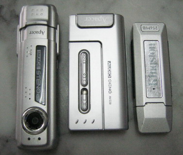 อันแรกจากซ้ายมือ สามารถถ่ายภาพนิ่ง และไฟล์วีดีโอได้ อีกทั้งสามารถใช้งานเป็น web camในตัวด้วย อะไรจะขนาดนั้น แต่ความจุไม่มากเท่าไหร่ แค่ 128MB และขนาดตัวที่ใหญ่กว่าชาวบ้านเค้า ตัวที่สองเป็น flash driveที่มีการรวมเอาเครื่องเล่น MP3 ไว้ด้วย สามารถถอดแยกออกจากกันได้ เวลาจะฟังเพลงก็ประกอบกันดังในรูป และเสียบหูฟัง พร้อมใส่ถ่าน AAA 1ก้อน เข้าไป ก็บันเทิงแล้วครับท่าน พอถอดแยกตัวเปล่าๆออกมา ก็ใช้เก็บข้อมูลได้ตามปกติ ไอเดียดีทีเดียว ส่วนอันที่สาม แบบปกติครับผม ไว้เก็บข้อมูลล้วนๆ ยี่ห้อ kingston ราคาไม่แพง หน้าตาพอใช้