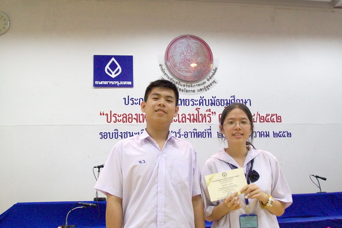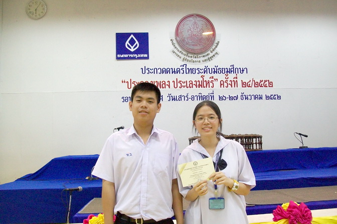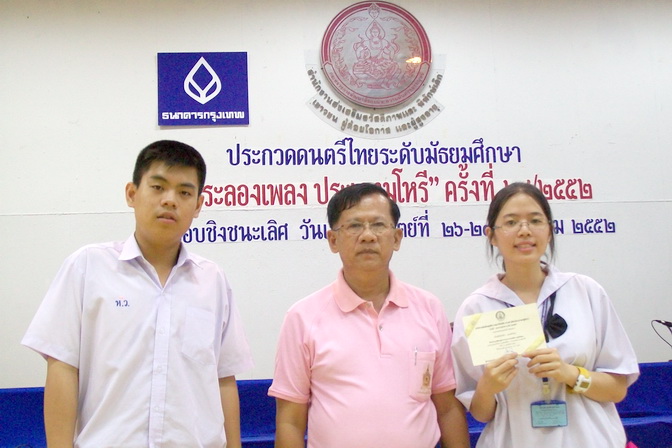 ลุ้นกันมาหลายเดือนในที่สุดก็ถึงวันนี้ประลองเพลง ประเลงมโหรี ครั้งที่ 24/2552ชิงถ้วยพระราชทาน สมเด็จพระเทพรัตนราชสุดา สยามบรมราชกุมารีมารายงานตัว จับฉลากกันแต่เช้าเสร็จแล้วก็ไปซุ่มซ้อม เป็นโอกาสสุดท้ายข้าวปลา ไม่ต้องกินมันละ กินไม่ลงจ้า ตอนขึ้นแข่ง มัวแต่ลุ้น ลืมถ่ายรูปซะงั้นแข่งครบ 29 คน รับประกาศนียบัตรก่อนเลยนี่ค่า ประกาศนียบัตรผู้เข้ารอบชิงประกาศผลรางวัลชมเชย 4 คนไม่มี ไม่มี ต้องไม่มีเรา ... ไม่มีผู้ได้รับรางวัลที่ 3 ... กรี๊ดดดดดดดดดดดดด ที่ ส อา ม สาม สามเอาไปให้ครูก่อนเลยยยยขอบพระคุณ คุณครูค่ะขอบคุณน้องโบว์ (ขวา) คนฉิ่งค่ะขอบคุณเมฆ คนโทน รำมะนา ค่ะขอบคุณครูป้าวัชร์ และคุณครูบ้านอรรถกฤษณ์ทุกท่านค่ะ ขอบคุณพี่เอิร์ธค่ะขอบคุณพี่น้อง คนดนตรีไทยทุกท่าน ขอบคุณ สท //opp.go.th/ ขอบคุณศูนย์สังคีตศิลป์ ธ.กรุงเทพค่ะขอบคุณป๊ากับแม่ค่ะขอบคุณตัวเองที่ฝึกซ้อมขอบคุณพี่โน้ตที่มาติวให้ดึกๆขอบคุณ ขอบคุณ ขอบคุณความสำเร็จที่ได้มาจากความพยายาม ช่างหอมหวานยิ่งนักค่ะ