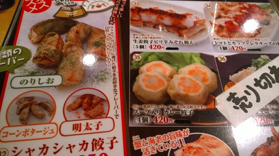 ว่างๆ ไม่รู้จะไปไหน ไปลูบน้องวัวเล่นที่ Tenmangu ดีกว่า ขึ้นรถไฟไปโลด Minami Morimachi โผล่ขึ้นมาหน้าซุปเปอร์ หัวมุมสี่แยกพอดี กลับหลังหัน เลี้ยวขวา ตามป้าย Tenmangu เลี้ยวขวาเข้าตลาด Tenjinbashi  มองซ้ายมือ เจอร้านหน้าตางี้ ใช่เลย  เมนู อันนี้เค้าบอกว่า ติดท็อปไฟว์ เมนูยอดนิยม มาเป็นแพ แพละ 8 ตัว 280เยน สั่งแพเดียวก็ได้  อันนี้ มาเป็นเส้น เส้นละ 400 สั่งสองเส้น 750yen อันนี้ มาเป็นลูก 4ลูก 420yen เมนูบอกว่า เป็นเกี๊ยวซ่า ซุปแกงกะหรี่  สั่งไปละ นั่งจิบน้ำ ถ่ายรูป ส่องคนทำไปพลางๆ ระหว่างรอ   ไปช่วงบ่ายกลางๆ ไม่ค่อยมีคนดีนะ  ทยอยมา ทีละจาน ไม่ขาดตอน จานแรก เป็นแบบธรรมดา 1 แพ 8 ตัว ... ลืมถ่าย 555 นึกได้ตอนเหลือ 5 ตัว อร่อยจริงๆนะ  จานที่สอง แบบเส้น แม่เจ้า!!! ทั้งกุ้ง ทั้งปู เต็มๆอ่ะ รสชาติก็นุ่มมากๆ อร่อยจริงๆๆๆๆ  จานสุดท้าย อันนี้มาในช้อนเลย เพราะไส้ข้างในเป็นซุป แบบเสี่ยวหลงเปา แต่อันนี้เป็นซุปใสรสแกงกะหรี่ ... อร่อย ไม่รู้จะใช้คำไหนอ่ะ โอชา .. เลิศรส .. โออิชี่ อี้ อี้ ซองตะเกียบ ถ่ายมาให้ดู website เผื่อจะไปลองกันที่เมืองอื่น เข้าไปหาเอาได้  ตรงข้ามร้าน เป็น โค รก เกะ ชิ้นละ 80 เยน คิวย้าวยาว โดนไปอีกคนละอัน