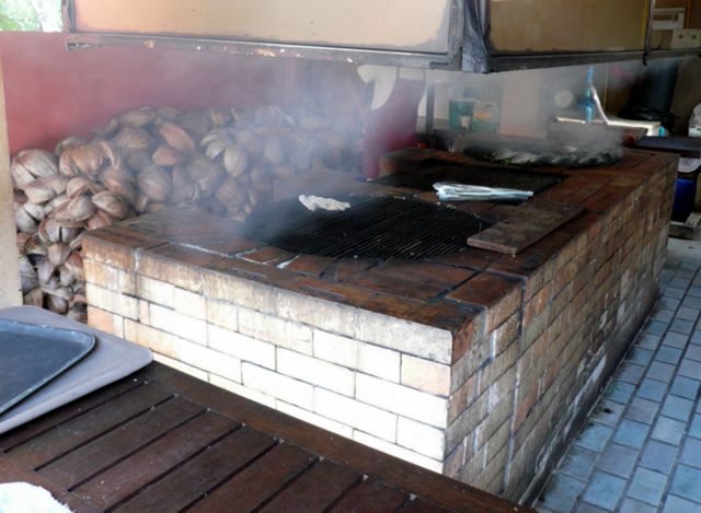 เตาย่างปลาร้านกันเอง จะเห็น กองกาบมะพร้าวอยู่ด้านหลัง