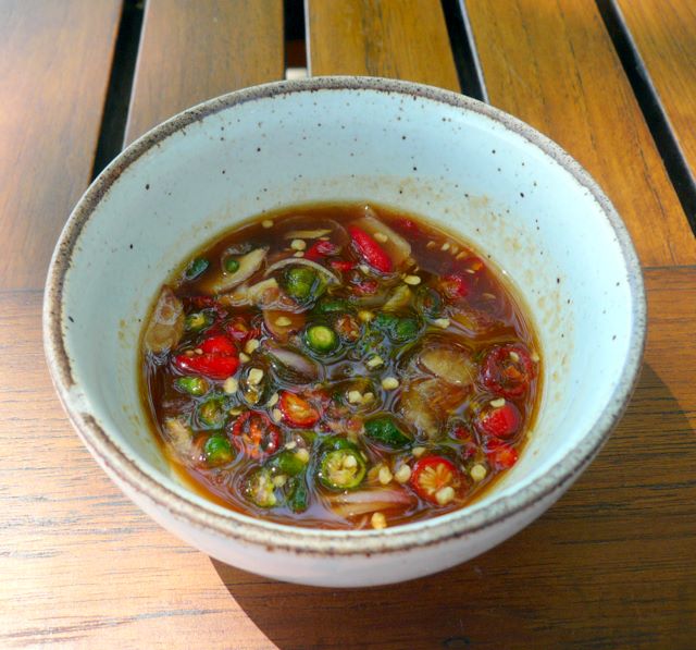 ปลาเผาหอมกลิ่นควันจากกาบมะพร้าว เป็นปลาเผาแบบตำรับภูเก็ตแท้ๆ ดังนั้นก็ต้องทานปลาเผาด้วยน้ำจิ้มแบบภูเก็ต ที่ทำจาก น้ำส้มมะขาม ซีอิ้วหวาน หอมแดงซอย และ พริกขี้หนู