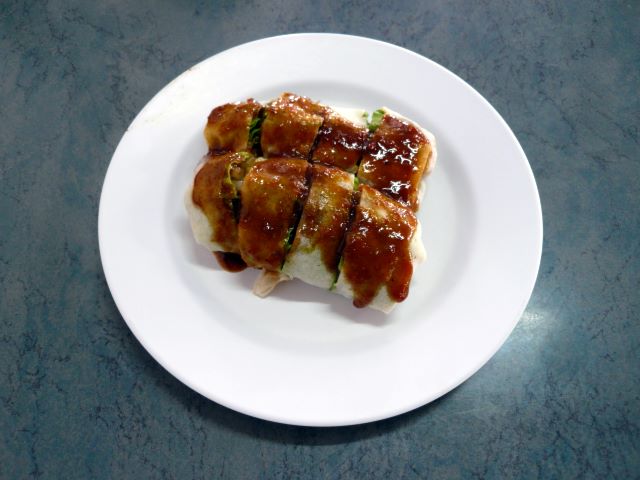 และราดด้วยน้ำซอสรสบ๊วยสีแดงเข้ม ที่เรียกกันว่า "ตีเจียว"