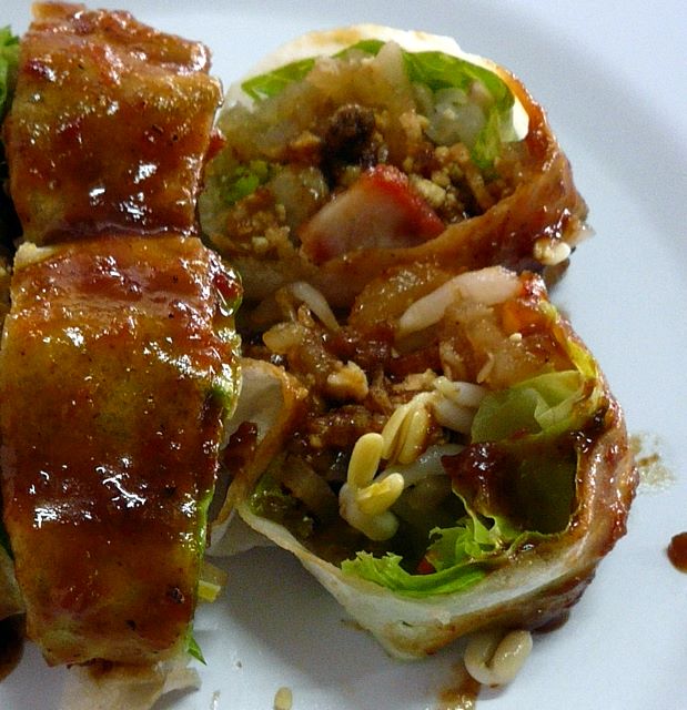ปอเปี้ยะห่อใส้มันแกวผัด โรยหน้าด้วยหมูแดง ปู หอมเจียว