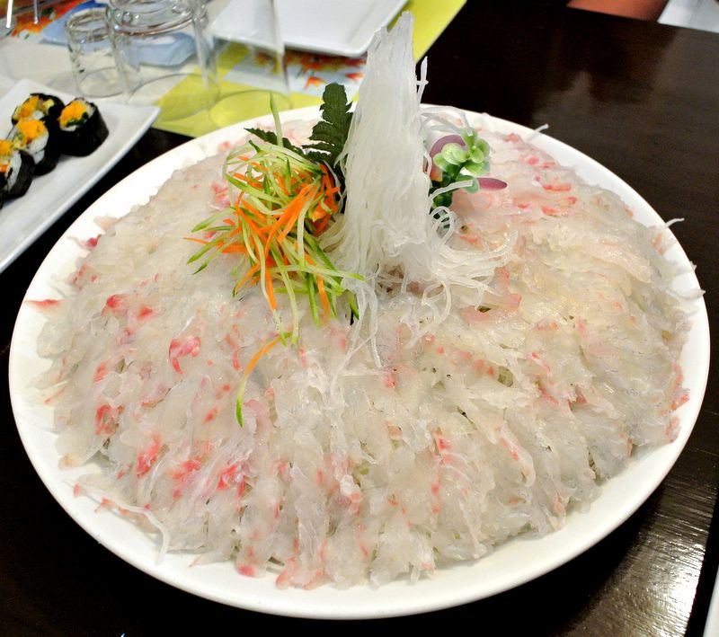 เนื้อปลาหั่นเป็นชิ้นบาง แบบเดียวกับ ฮือแซ-ปลาดิบจีน