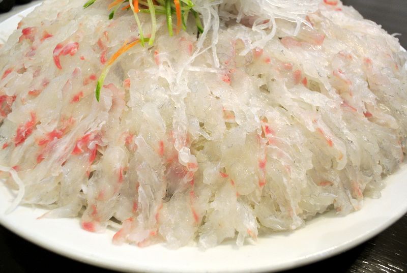 ปลาดิบจะมาจากเนื้อปลาเก๋า หั่นเป็นชิ้นบาง วางบน หัวไชเท้าขูด