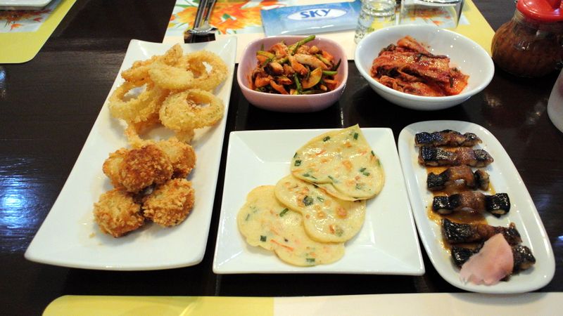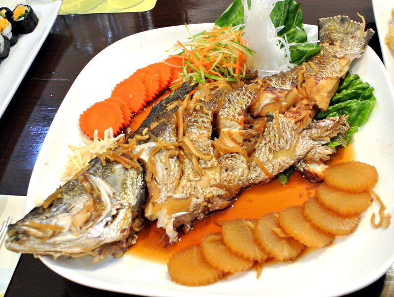 สั่งปลากระพงทอดราดขิงแบบเกาหลีมาเพิ่มเพราะมีคนไม่ทานปลาดิบ รสชาติอร่อยดี