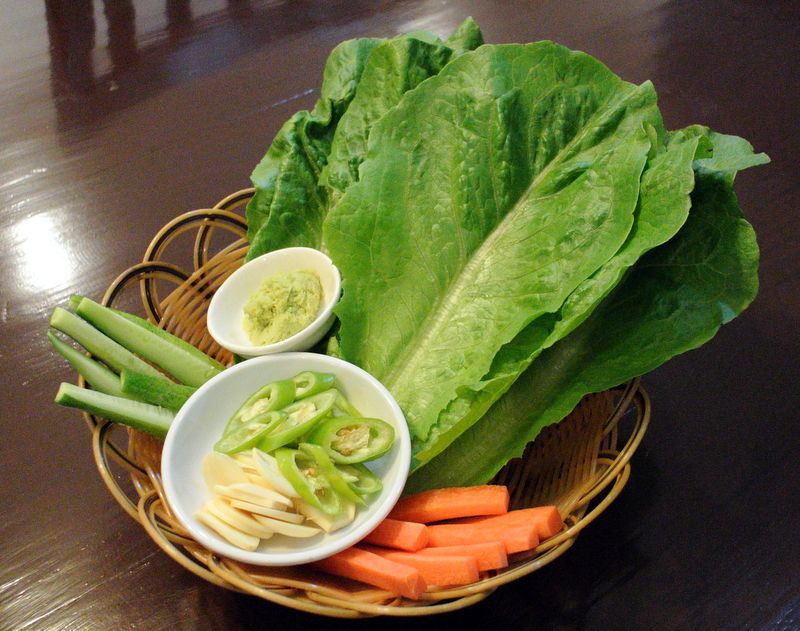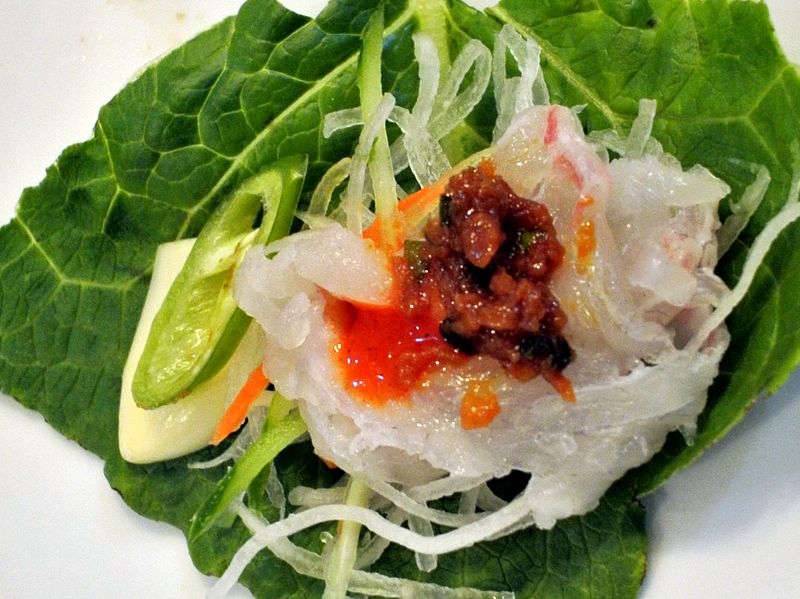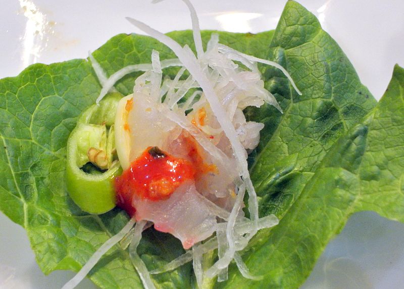 ทานปลาดิบเกาหลี โดย ใช้ใบผักกาดห่อปลาดิบราดซอส ใส่หัวใชเท้า พริก กระเทียม