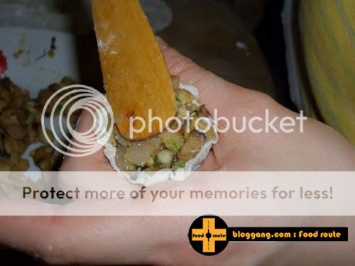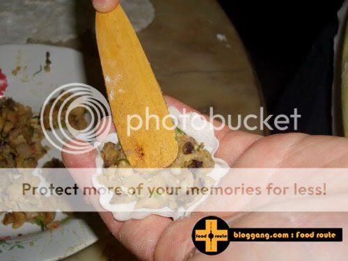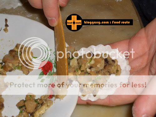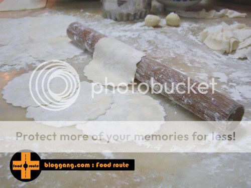 ลงมือลงไม้: 1.ร่อนแป้งทั้ง2ชนิดรวมกันลงในชามผสม เติมเกลือ แหวกส่วนผสมให้เป็นหลุม 2.ผสมน้ำร้อนกับน้ำมันพืชรวมกัน เทลงในหลุมแป้ง 3.ค่อยๆใช้นิ้วคนๆให้ส่วนผสมไหลลงมารวมตัวกับน้ำ 4.พอแป้งเริ่มดูดน้ำหมด จับตัวเป็นก้อนปั้นได้ก็นวดจนก้อนแป้งเนียน(นวดประมาณ 3-5นาทีค่ะ) 5.ตัดเป็นก้อนละ 10 กรัม โรยแป้งนวลลงบนโต๊ะ คลึงเป็นแผ่นบางๆ 6.เอาพิมพ์กลมเส้นผ่าศูนย์กลางประมาณ 2นิ้วครึ่ง กดลงบนแป้ง เก็บใส่ถุงพลาสติกไว้ไม่ให้โดนลมค่ะ