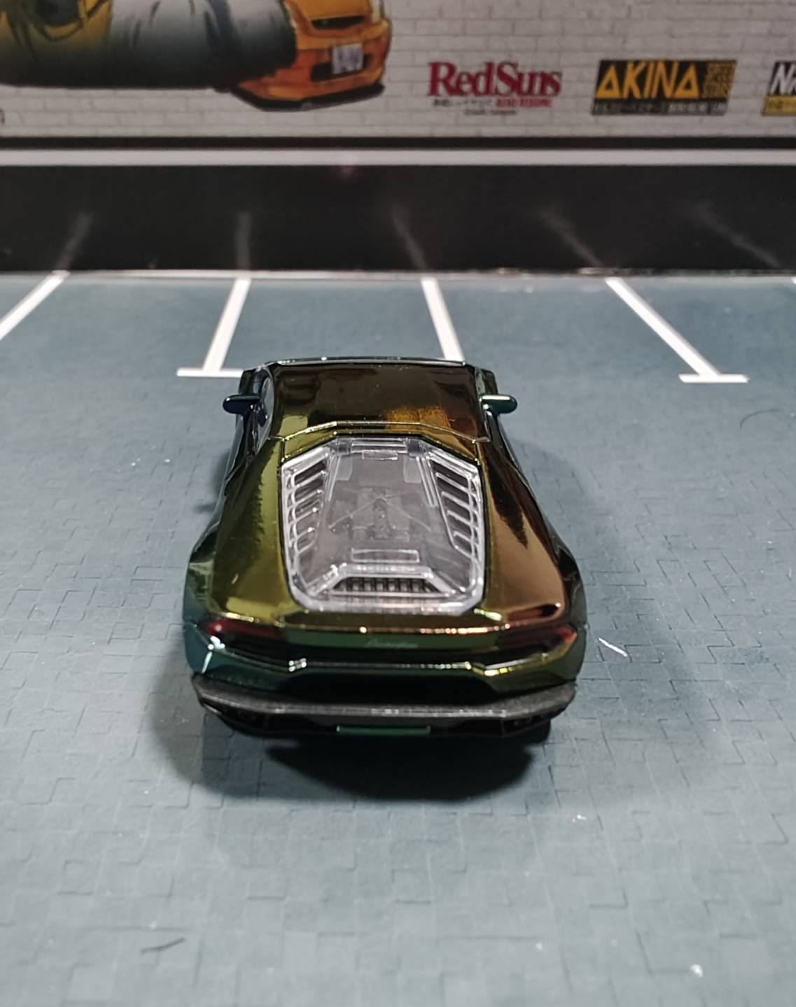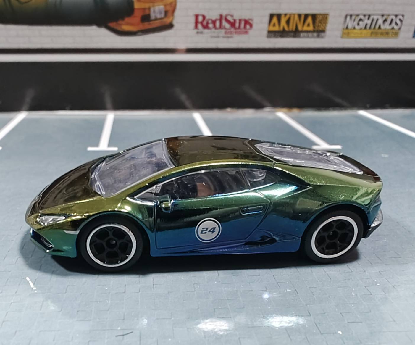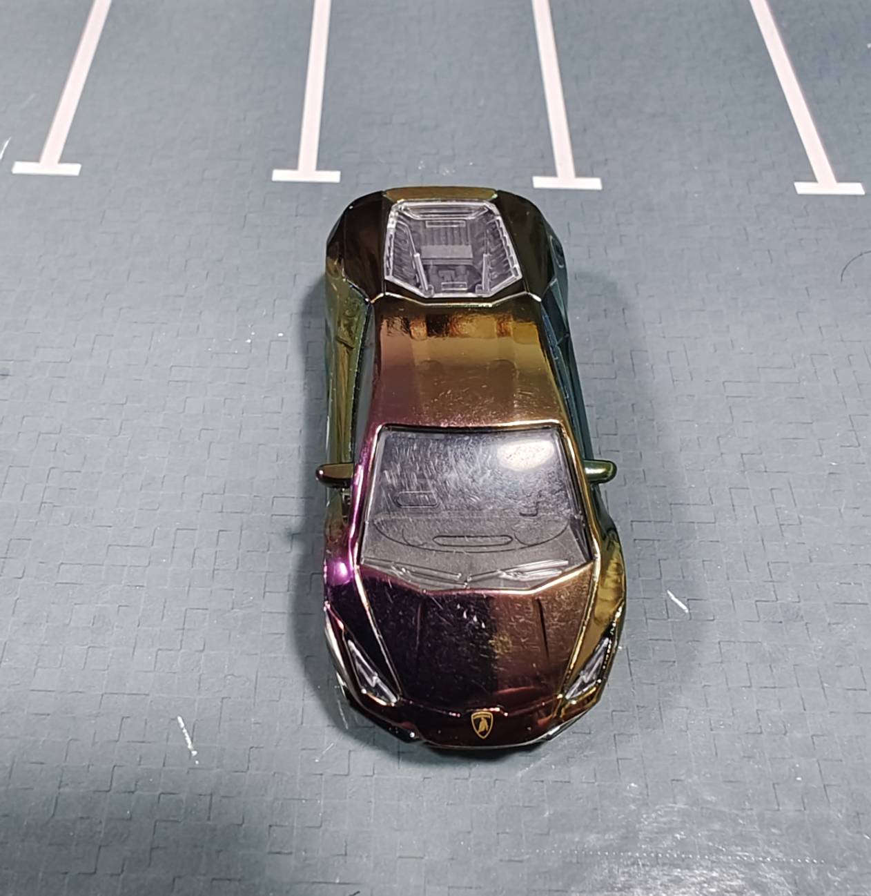 ลัมโบกนี่ ตัว Chase car ปี 2024 สีรุ้ง ตัวนี้หายากกว่าอีกตัว ด้านหน้ามีโลโก้กระทิงชัดเจน ไฟหน้ากลืนกับรถไปหน่อยมองยาก