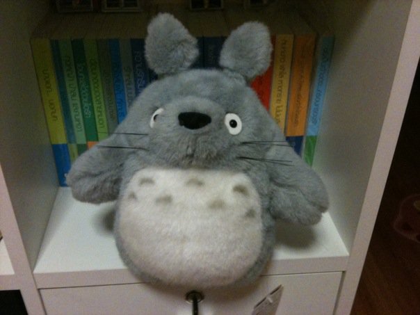 เป็นตัวสีเทาขนาดใหญ่ เป็นเจ้าแห่งป่าเขาครับ นิสัยใจดีน่ารัก และรักเด็ก ตุ๊กตา Totoro ตัวนี้ผมได้เป็นของขวัญวันแต่งงานจากน้องที่ office คนนึงเค้าซื้อมาฝากจากญี่ปุ่นครับ ผมได้เค้ามาเก็บไว้ 2-3 ปีแล้วครับ เค้าก็อยู่คนเดี่ยวโดดเดี่ยวในตู้หนังสือที่บ้านมานาน จนกระทั่ง....