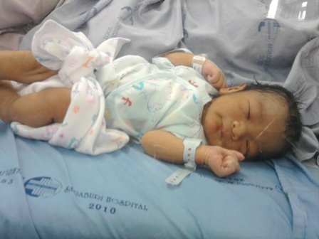 วันพฤหัสบดีที่ 15 กรกฎาคม เวลา 11:00 น.อิแม่หิวโซชวนป๊าไปกินก๋วยเตี๋ยวเจ้าประจำที่เพิ่งเปิดใหม่เมื่อต้นเดือน ก็ไปนั่งกินๆ จนอิ่ม และต่อด้วยขนมถ้วย และกล้วยแขก โดยไม่ลืมที่จะซื้อกล้วยติดมือกลับบ้าน กลับไปถึงบ้านก็สังเกตว่าน้ำอะไรวะ มันไหลเฉอะแฉะ ก็เลยไปอาบน้ำ เพราะเฝ้าดูอาการมาตั้งแต่วันอาทิตย์ที่ไปตรวจปากมดลูก ลุงหมอก็บอกว่าเปิดแล้ว 2 cm. ก็ให้กลับมาดูอาการ วันนี้คงไม่ต้องรออะไรแล้ว แม่ก็อาบน้ำ แต่งตัวไป รพ. ดีกว่า เพราะ 16 ก.ค. ลุงหมอก็นัดคลอดอยู่ดี ก็ไปถึง รพ. เที่ยงกว่านิดๆ Admid แล้วก็ไปนอนรอที่เตียง พยาบาลที่หวอดก็ไม่ยุ่งไม่อะไร รอดูอาการ ซักพักก็มาตรวจปากมดลูก ก็ยัง 2 เซน พยาบาลก็เลยโทรไปหาลุงหมอว่าแม่มา Admid แล้วแต่ก็ยังไม่คืบหน้า ว่าไง ลุงหมอสั่งจ่ายยา ให้ใส่สายน้ำเกลือ เร่งคลอดแต่ก็ไม่ปวดไม่ค่อยรู้สึกอะไร แม่ก็นอนรออยู่อย่างนั้น เตียงข้างๆ เค้าก็คลอดกันไปหลายคนแล้ว ป๊าก็รอแม่อยู่ที่หน้าห้องว่าเมื่อไหร่จะคลอด ซักที จากเที่ยงไปบ่าย ไปถึง 6 โมงเย็น แม่ก็ยังไม่มีทีท่าว่าจะออกง่ายๆ ป๊าก็รอจนญาติที่เค้ามารอคลอดเริ่มทยอยกลับกันหมดป๊าก็เลยกลับ เพราะถึงอยู่ก็โดดเดี่ยวติดต่อกันไม่ได้อยู่ดี 2 ทุ่ม ป๊าโทรเข้ามาที่ห้องรอคลอดว่าไปถึงไหนแล้ว แม่ก็ยังนอนอยู่ที่เดิม แต่แม่รู้สึกลูกเริ่มดิ้นน้อยลงนะ นักเรียนหมอก็เค้ามาดูอาการบ้าง มาพาแม่ไป U/S แต่ก็เหมือนยังไม่เก่งอ่านค่าอะไรก็ไม่รู้ แต่แม่เห็นว่าหนูนอนอยู่ในท้องแม่ตัวยาวเชียวล่ะ เห็นน้ำคล่ำที่เริ่มลดลงเรื่อยๆ ใจคอแม่ตอนนั้นไม่ดีเอาซะเลย เป็นกังวลไปสารพัด ห่วงก็แต่หนูนั่นแหละ กลับมานอนรอที่เตียงต่อ แม่ก็เลยถาม นร.แพทย์ ว่าตอนนี้ปากมดลูกน่าจะเปิดไปกี่เซนแล้วนะ นร.แพทย์ก็ตรวจให้แล้วบอกว่า 4 เซน แต่จริงๆ อ่ะ เค้าไม่น่าจะตรวจเลย เพราะอีกไม่ถึง 20 นาที ลุงหมอก็โทรมาให้พยาบาลมาตรวจแม่อยู่ดี พยาบาลก็ บอก 2 เซนเท่าเดิมไม่เปิดเพิ่ม แป่ว!!!!!!!! แล้ว 4 เซน เมื่อกี้อ่ะ โดนหลอกตรวจฟรีซะงั้น น่าอายจัง 3 ทุ่มแล้วนะ ป๊าโทรมาอีกรอบ พยาบาลบอกแม่แล้วก็ชมว่าป๊าเธออ่ะดีนะเป็นห่วงภรรยาโทรมา 2 รอบแล้ว อีตอนรอบแรกอ่ะแม่ไม่รู้หลอก ซักพักลุงหมอก็มามาตรวจปากมดลูกอีกที เพื่อความแน่ใจก็ยังเท่าเดิมอ่ะนะ แล้วก็สั่งเร่งยา จนอิแม่มันเบลอและตอนนั้น ปวดท้องเหมือนกันนะแต่ไม่ร้อง ยังทนได้ พยาบาลก็มาตรวจชีพจรลูกว่ายังเต้นปกติมั๊ย แต่มันไม่ปกติแล้วนะ แม่ก็รู้สึก กราฟ ขึ้นสูงมาก แล้วก็ไม่ค่อยเป็นจังหวะพยาบาลก็บอกแม่ว่าคุณยังไหวมั๊ย ถ้าเร่งไปกว่านี้คงไม่ได้แล้วมั้งมดลูกแต