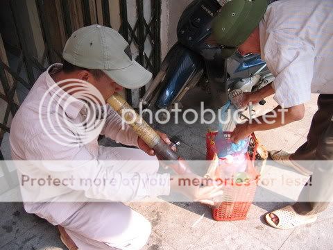 อันนี้เด็ดขอบอก อิอิ เลยขอลองซักหน่อย เหมือนบ้องกัญชาเลย แต่ยาที่ใช้ดูดเป็นยาเส้น ลองไปสองปื๊ด มึนเลยขอบอก อิอิ มีเกลื่อนเมือง จ่ายไป 2,000 Dong (วานคนขายเป็นนายแบบให้หน่อย หุหุ) ถ้าเป็นเมืองไทยใด้ไปกินข้าวแดงแน่เลยอะ