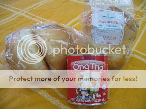 ไหนๆก็เข้าไปแล้วหาอาหารเช้าสำหรับพรุ่งนี้ซักหน่อย ขนมปังเบอร์เกอร์ สองห่อ ราคา 14,000 Dong นมข้นหวาน 9,500 Dong