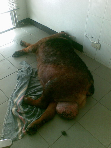 ไหนๆ ก็มาถึงโรงพยาบาลแล้ว ครั้นๆ จะฉีดยาให้กลับบ้านไปก็คิดว่าคงจะไม่เวิร์กแน่ เพราะดูอาการค่อนข้างหนักเหมือนกัน (ไม่กินข้าวแล้ว นอนตลอด หายใจหอบๆ อาการเริ่มผิดปกติมาได้ 1 เดือนแต่เพราะว่า ดุ!! และกินได้อยู่เลยไม่ได้พามาตั้งแต่เนิ่นๆ) ก็เลยต้องใช้คนถึง 6 คนในการยกจากหลังรถกระบะ ชั่งน้ำหนักได้ 90 กว่ากิโลกรัม แล้วยกต่อเข้ามาในห้องตรวจ ตัวใหญ่เกินโต๊ะตรวจ ก็ต้องวางบนพื้น