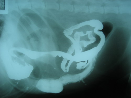 3 วันต่อมา โทรไปเช็คกับเจ้าของพบว่า น้องหมาไม่ทานอีกแล้ว .... ทำอย่างไรก็ไม่ทาน และถ่ายอุจจาระออกมาน้อยมาก ... แต่ยังคงมีเรี่ยวแรง รับแขกได้อยู่ น้ำหนักลงดลงไปกว่า 4 กิโลกรัม ..... สิ่งแรกที่ผมนึกถึงตอนสมัยเรียนวิชารังสีวิทยา ก็คือการป้อนแป้ง Barium ซึ่งเป็นสารทึบรังสีให้กับสุนัข เพื่อดูทางเดินอาหารว่ามีการอุดตันหรือไม่